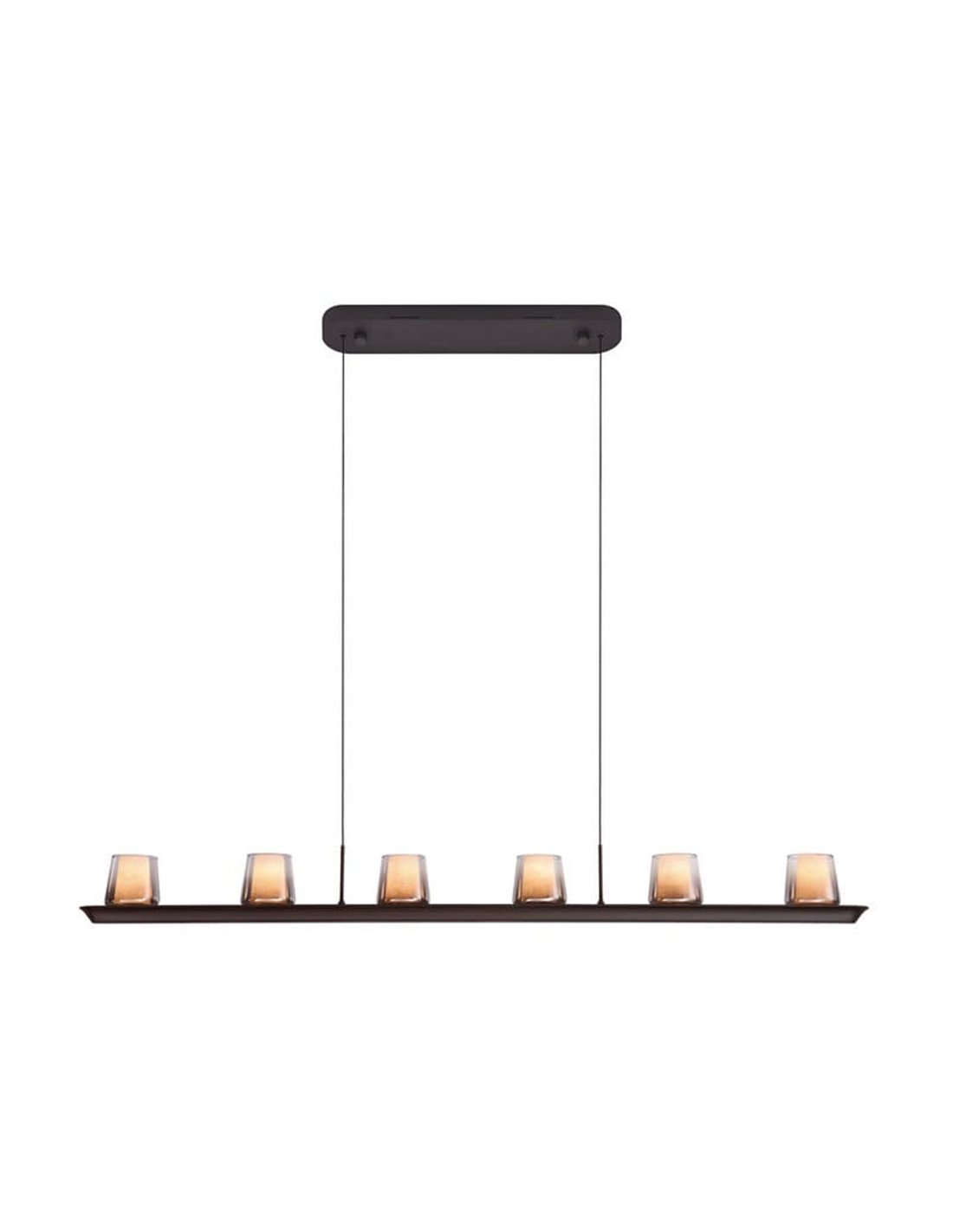 La grande suspension LED ALABASTRE est composée d'une tige métallique de 127 cm avec des abat-jour en albâtre naturel et offre un flux lumineux de 5 000 lumens . Sa lumière chaude de 3 000 K et son variateur TRIAC en font un luminaire idéal pour les grandes tables, les cuisines spacieuses ou les salons modernes.