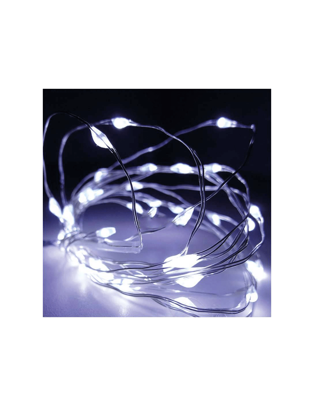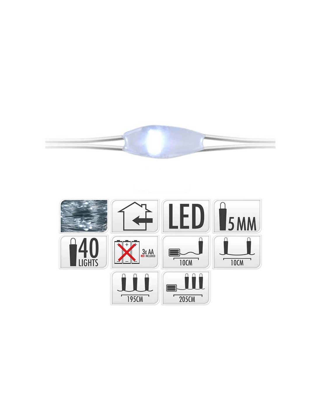 Guirlande lumineuse LED à 40 LED blanc froid avec fonction d'éclairage fixe . D'une longueur de 195 cm , les LED sont espacées de 5 cm et le câble d'alimentation mesure 10 cm ( longueur totale : 2,05 m ). Le fil argenté est souple, étanche ( IP20) pour une utilisation en intérieur et fonctionne avec 2 piles AA ( non fournies ). Idéale pour décorer avec créativité tables, étagères et comme centre de table pour Noël.