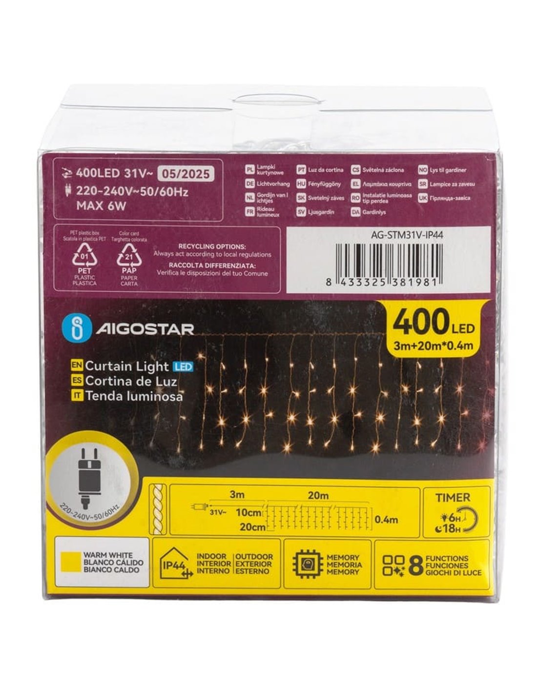 La guirlande lumineuse plate Aigostar de 20 m x 0,4 m, fonctionnant à basse tension, crée un rideau de lumière blanc chaud grâce à ses 400 LED encastrées réparties sur 100 brins . Son design ondulé, évoquant des stalactites, est idéal pour décorer fenêtres, balcons, avant-toits ou vitrines, offrant un effet uniforme et élégant.
