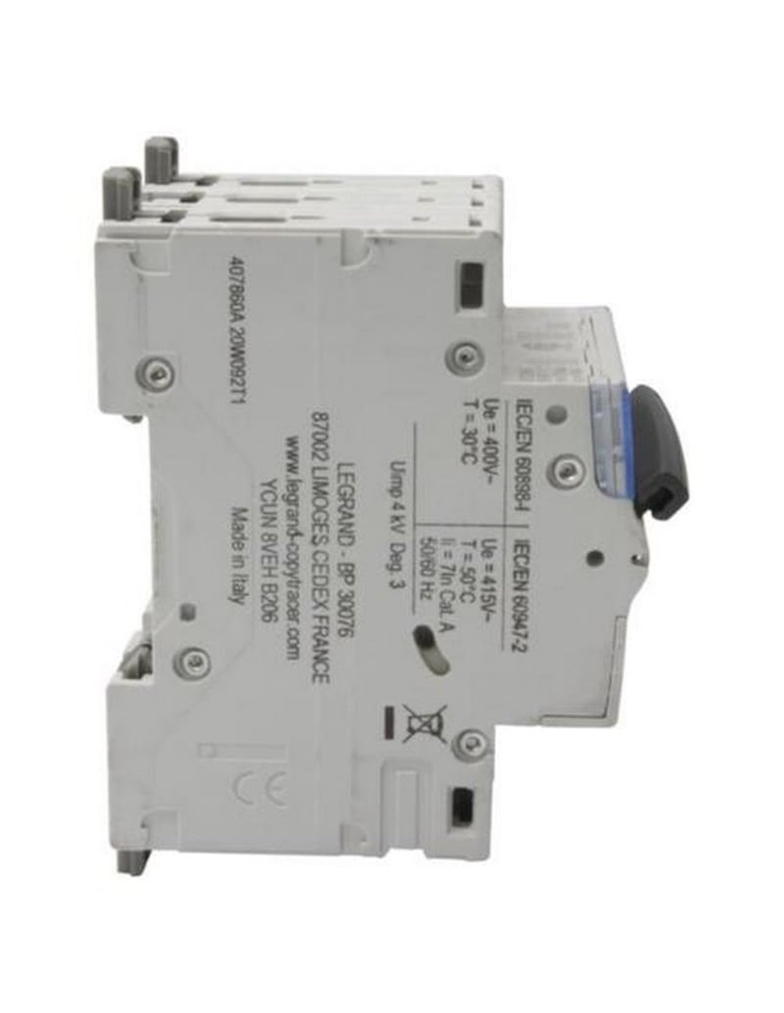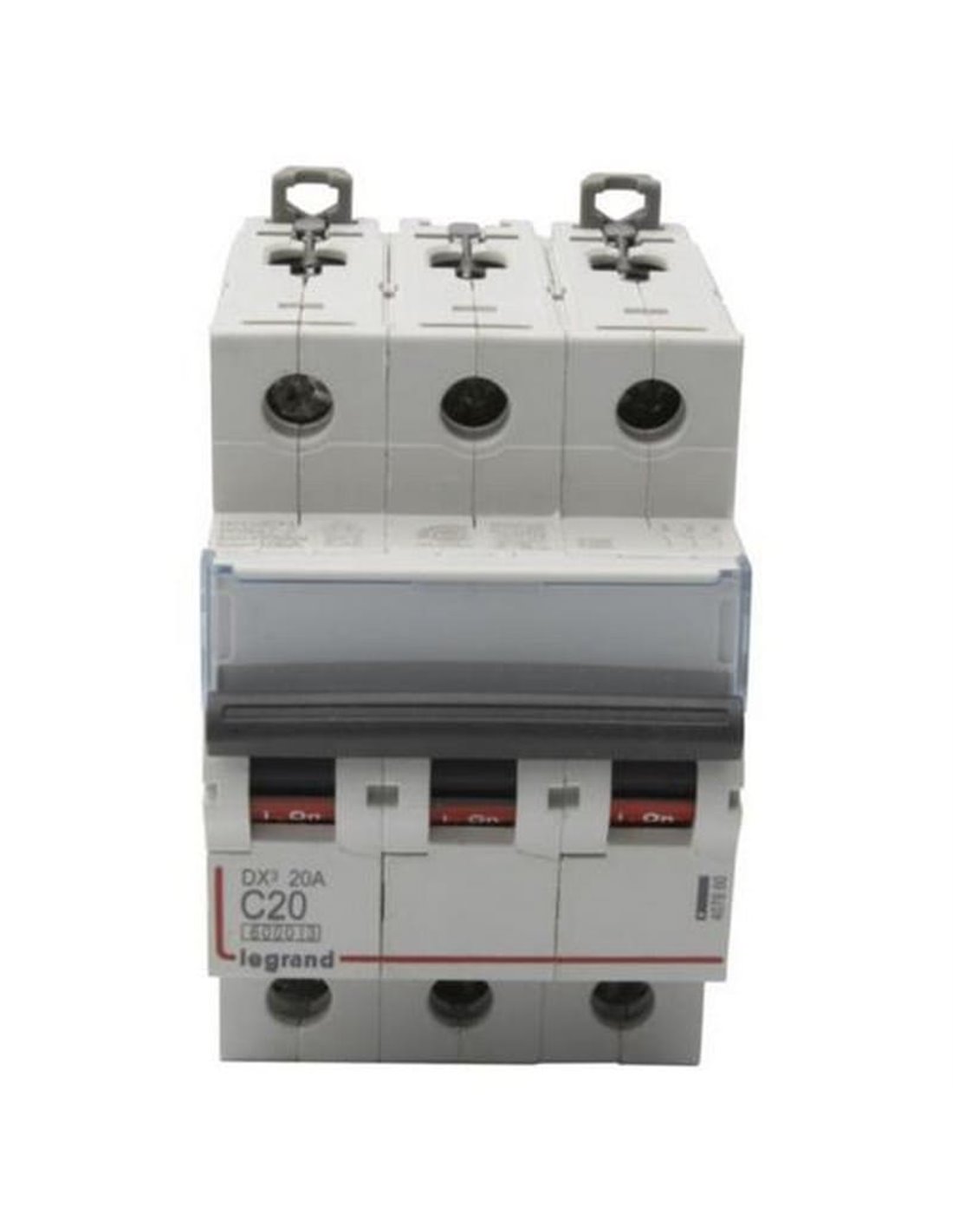 Interrupteur magnétothermique automatique Legrand DX³ 3P 20 A, courbe C , pouvoir de coupure 6 kA selon la norme IEC/EN 60898-1 . Bornes IP20 (protection des doigts), limitation d'énergie classe 3 et voyant ON/OFF . Compatible avec câble , peigne à fourche et fiche HX³ . Format 3 modules pour rail DIN, 400 V CA. Compatible avec les auxiliaires et blocs différentiels DX³ .