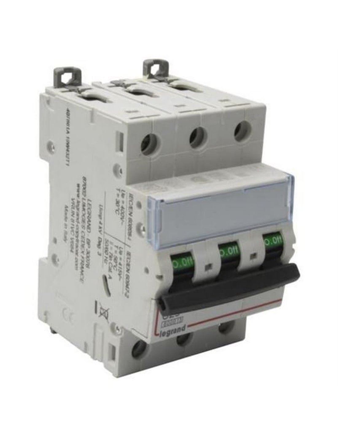 Interrupteur magnétothermique automatique Legrand DX³ 3P 25 A, courbe C , pouvoir de coupure 6 kA selon la norme IEC/EN 60898-1 . Bornes IP20 (protection des doigts), limitation d'énergie classe 3 et voyant ON/OFF . Compatible avec câble , peigne à fourche et fiche HX³ . Format 3 modules pour rail DIN, 400 V CA. Compatible avec les auxiliaires et les dispositifs différentiels DX³ .