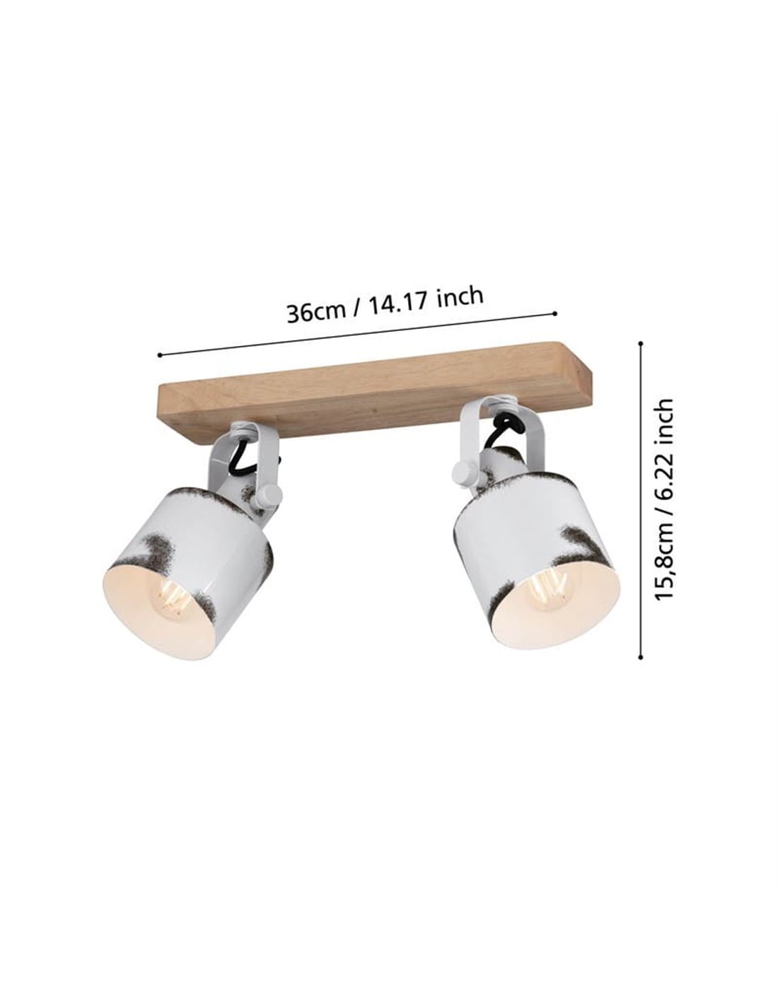 Applique KILBURN avec 2 spots mobiles en métal blanc et socle en bois massif. Compatible avec les ampoules E27 (non incluses). Parfait pour éclairer et décorer des pièces de style rustique.