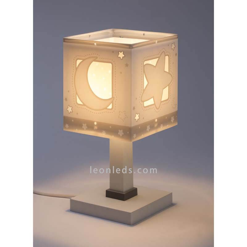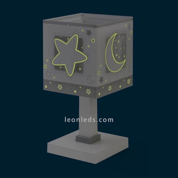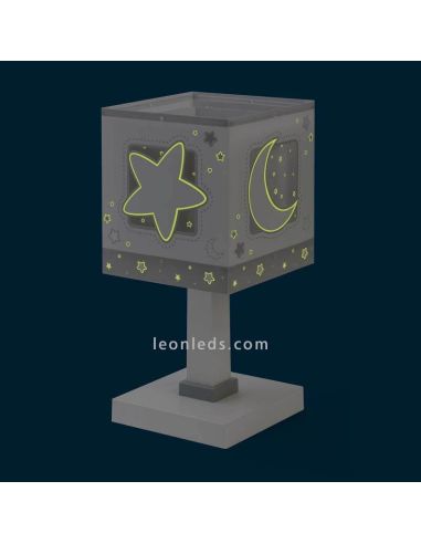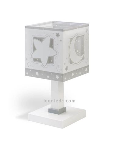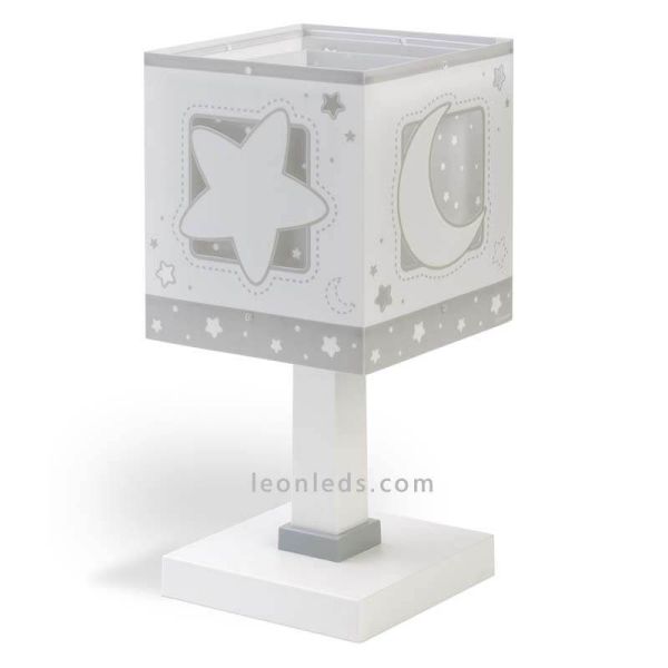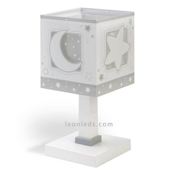 La nouvelle lampe de table Moon Light Grey, cette nouvelle lampe est plus haute et plus grande que le modèle précédent. La structure de cette Lampe est blanche avec un détail gris, l'écran est carré décoré d'étoiles sur fond blanc et d'étoiles et de lunes. Le contour des étoiles et des lunes brille dans le noir.