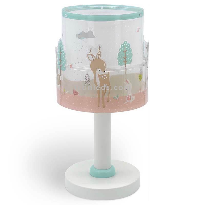 Lampe de table pour enfants de la collection Dalber Loving Deer . Il est réalisé avec un double abat-jour rond transparent, dans des tons pastel et décoré de dessins de cerfs et autres animaux de la forêt.
