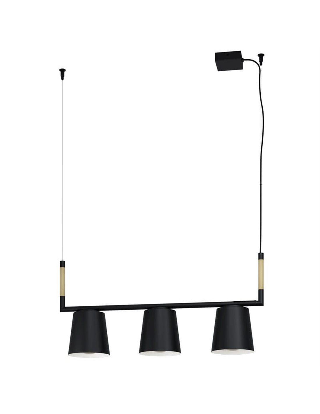 La suspension à 3 lumières LACEY d' Eglo présente trois abat-jours noirs avec des détails en bois naturel , créant une esthétique industrielle et rustique. Compatible avec les ampoules E27 , il est parfait pour éclairer les salles à manger, les îlots de cuisine et les espaces ouverts . Complétez l'ensemble avec d'autres luminaires de la série LACEY pour une décoration harmonieuse.