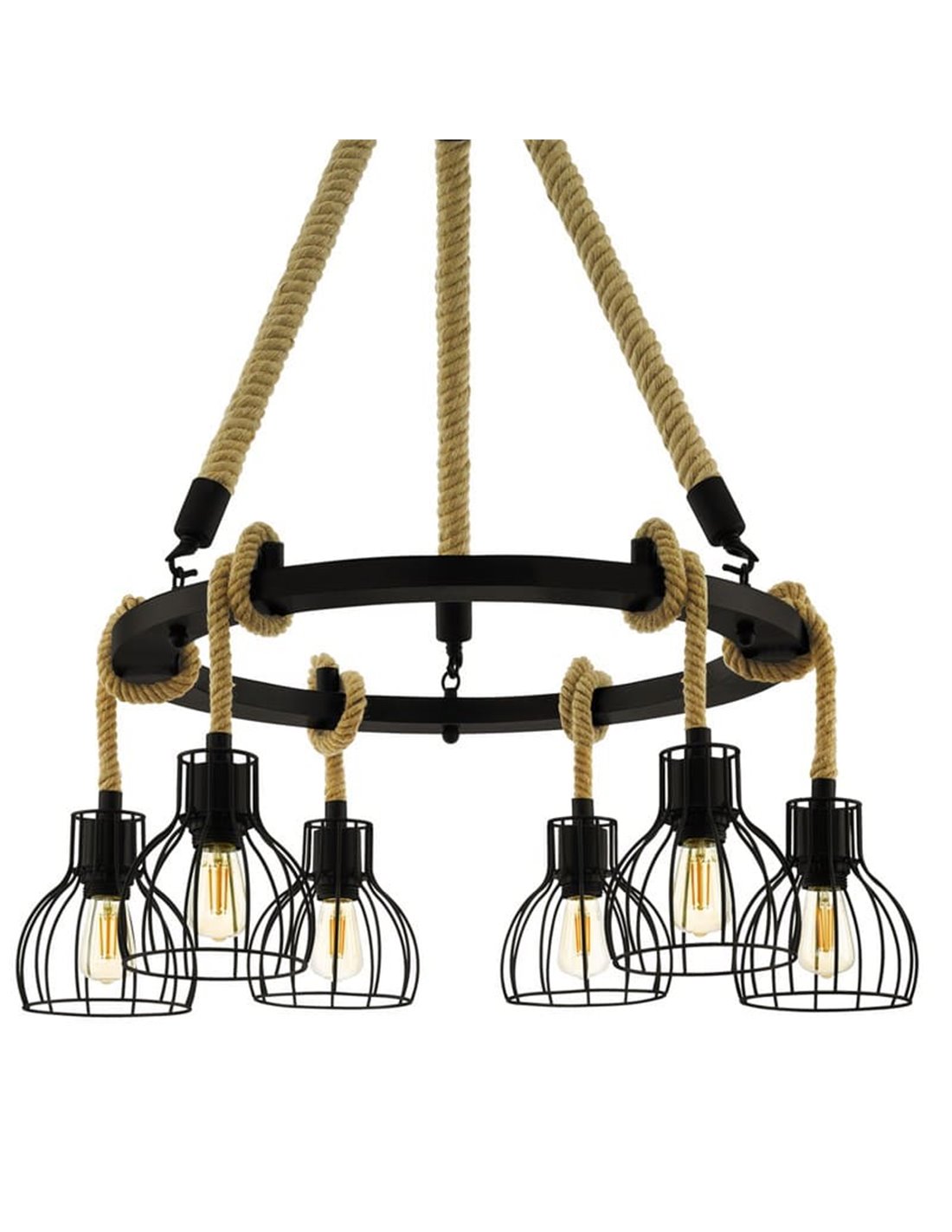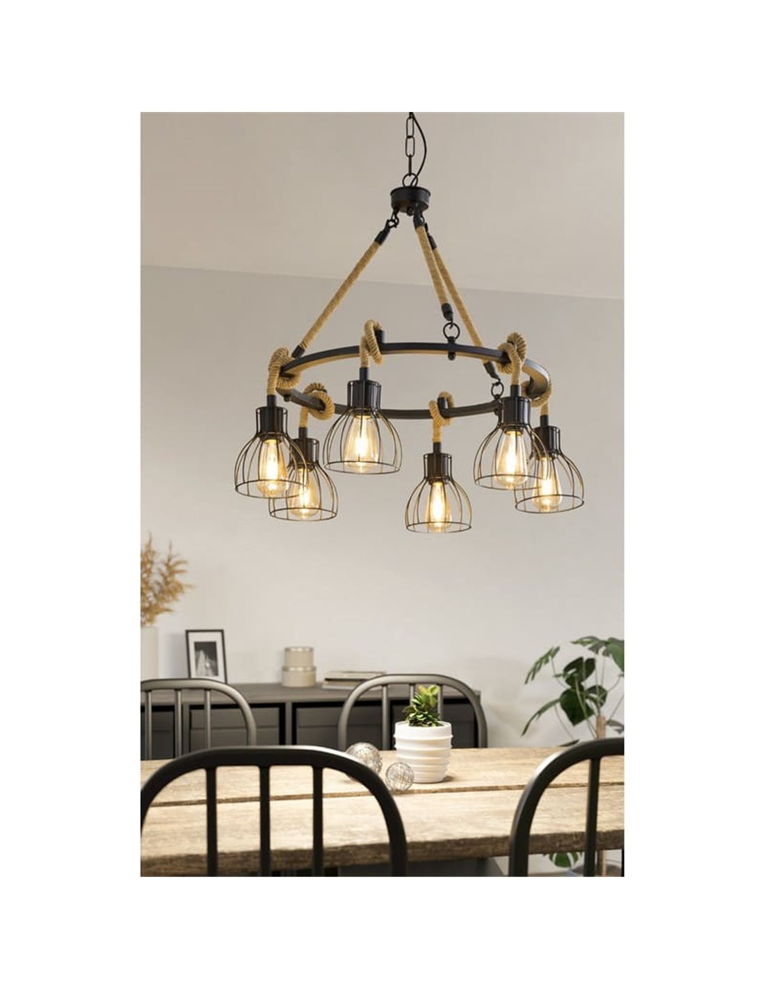 Lampe à suspension RAMPSIDE de Eglo, avec anneau en métal noir et six abat-jour en fil suspendu à des cordes de chanvre. Compatible avec les ampoules E27 (non incluses). Parfait pour éclairer les salons ou les salles à manger au style vintage.