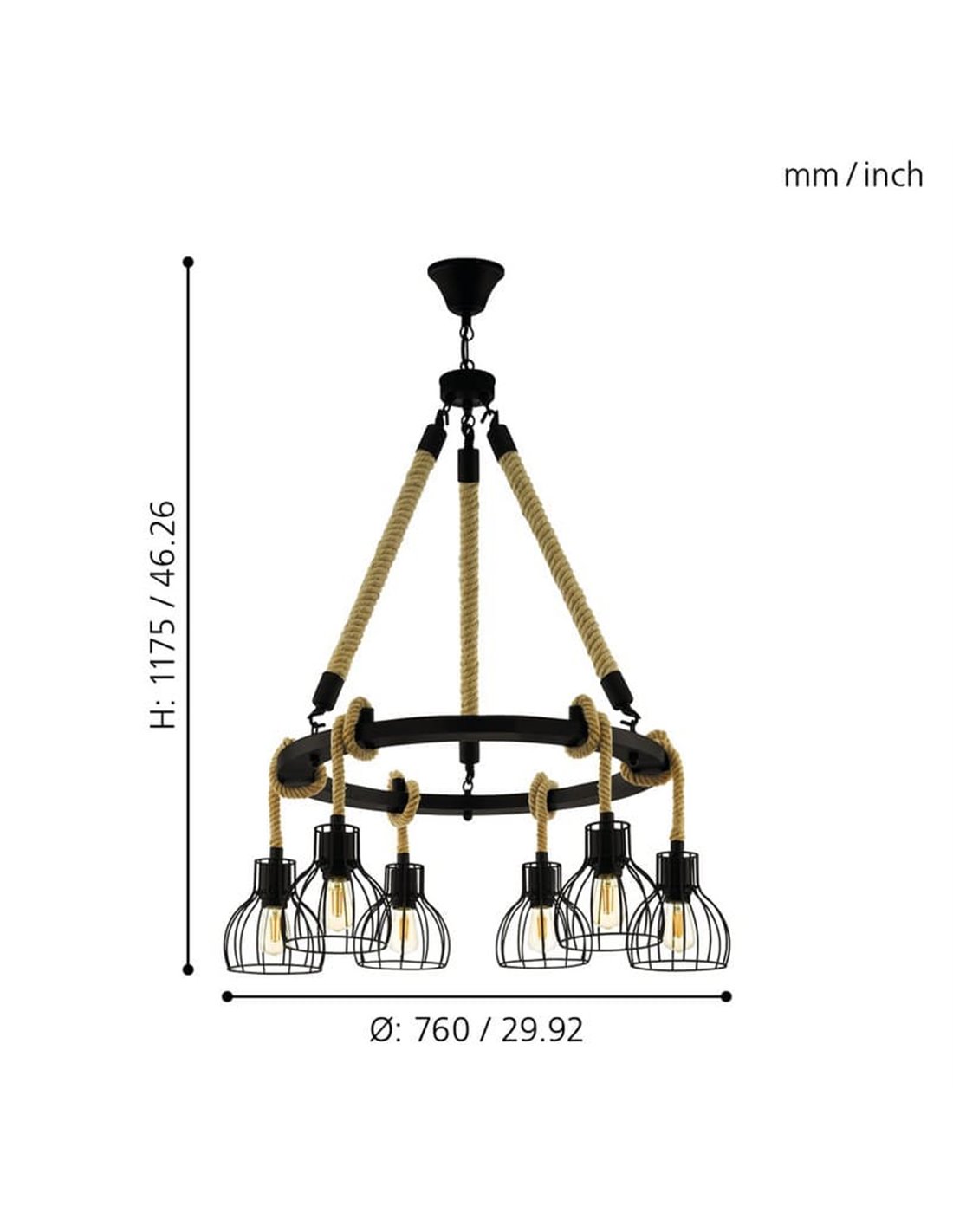 La suspension RAMPSIDE de Eglo est une pièce d'éclairage unique qui combine un anneau en métal noir avec six abat-jour en fil, suspendus à des cordes de chanvre réglables. Cette conception permet de suspendre les abat-jour à différentes hauteurs en enroulant simplement le câble, ce qui ajoute une touche personnelle et polyvalente à la décoration. Idéale pour les salons ou les salles à manger, cette lampe au style vintage offre un éclairage chaleureux et décoratif. Compatible avec les ampoules E27 (non incluses).