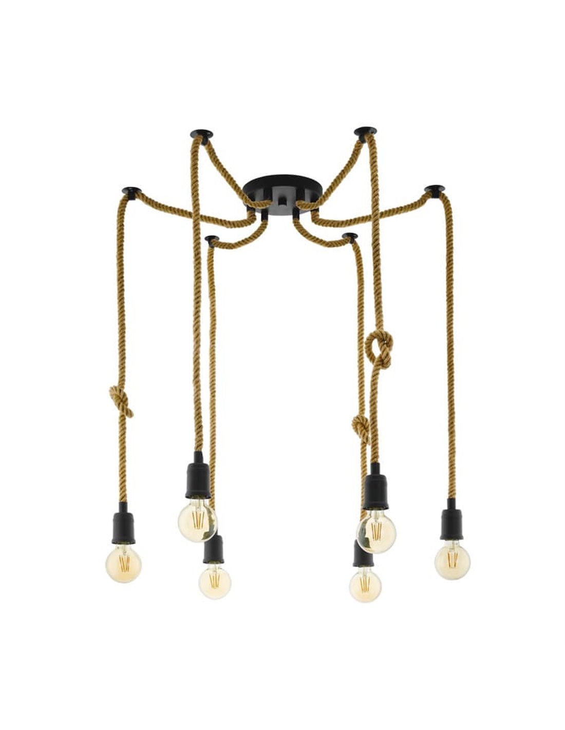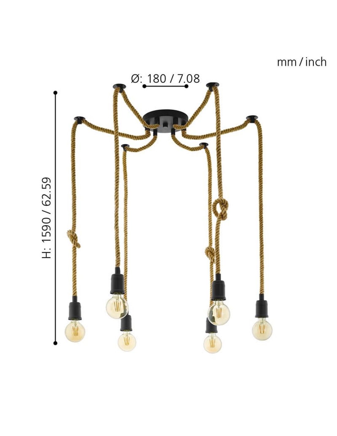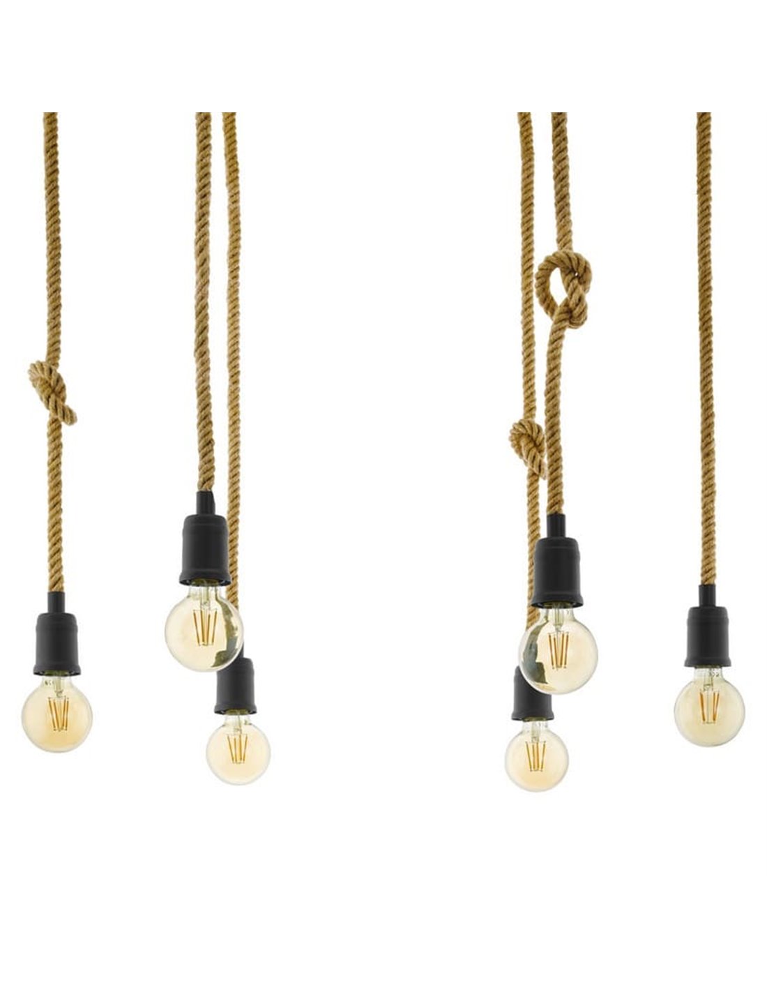 Lampe suspendue RAMPSIDE par Eglo, avec six douilles suspendues à des cordes de chanvre réglables. Compatible avec les ampoules E27 (non incluses). Parfait pour éclairer de grands espaces avec un style vintage.