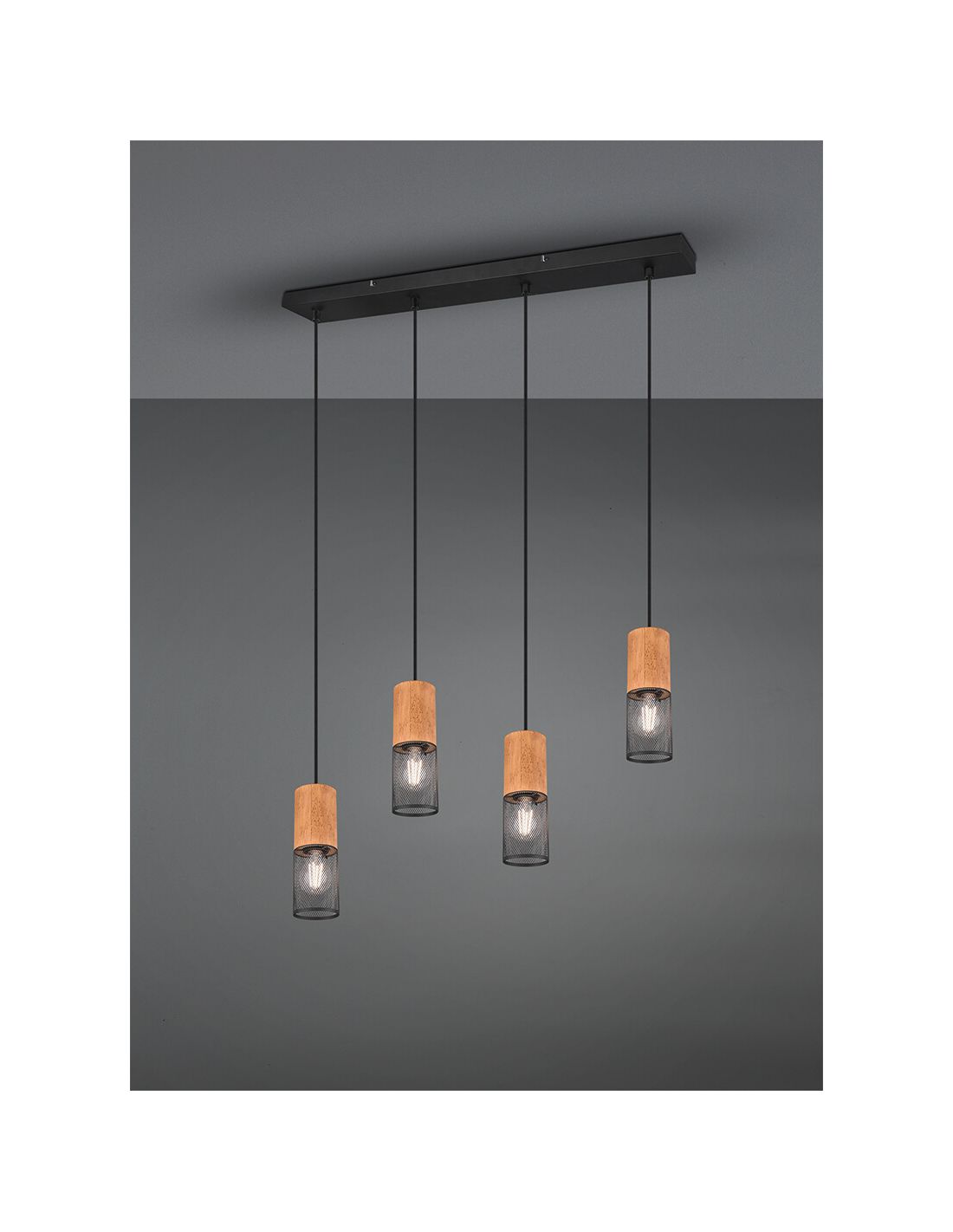 Plafonnier rectangulaire avec 4 spots suspendus de la collection Tosh de Trio Lighting. Il dispose de 4 spots suspendus avec des abat-jours en forme de filet en métal noir et de quatre bases en bois qui se connectent à quatre câbles noirs. Ces câbles se connectent à une base métallique qui est installée au plafond. Nécessite l'installation de 4 ampoules E27 (non incluses) d'un maximum de 40W. Vous pouvez choisir le ton clair que vous préférez en fonction de la pièce et de sa taille. Chez LeónLeds, nous recommandons l'installation d'ampoules de style vintage à filament visible pour mettre en valeur leur style rétro-industriel.