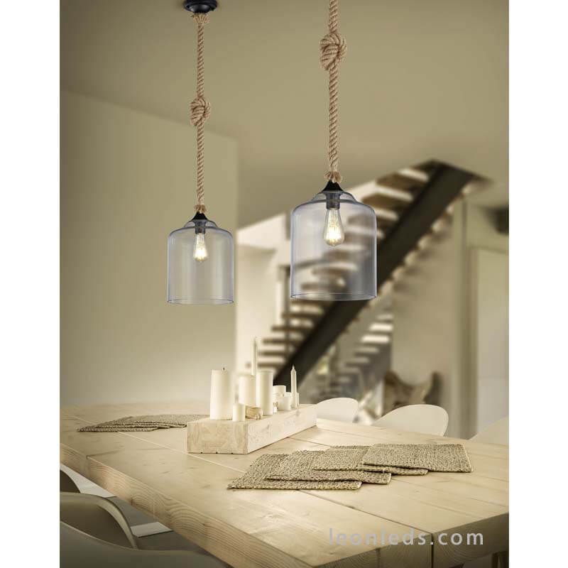Plafonnier en corde de style vintage avec une base de plafond ronde noire et un diamètre de 13cm. Le plafonnier vintage Judith a une hauteur totale de 150 cm qui peut être raccourcie au moyen de nœuds comme celui de la photo jusqu'à ce qu'il soit ajusté à la taille souhaitée et un abat-jour en verre d'un diamètre de 24,5 cm, dimensions que l'on peut voir sur une des photos.