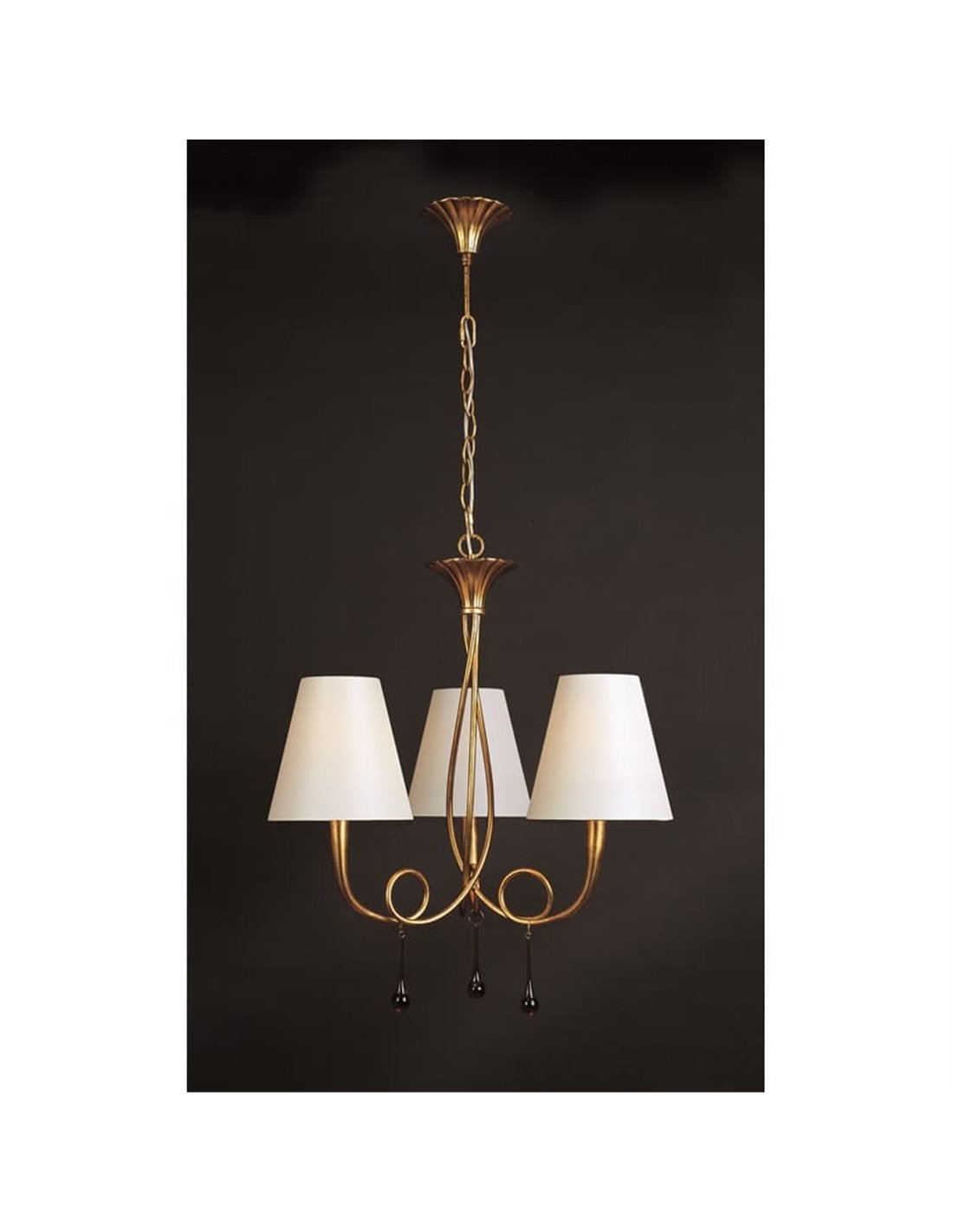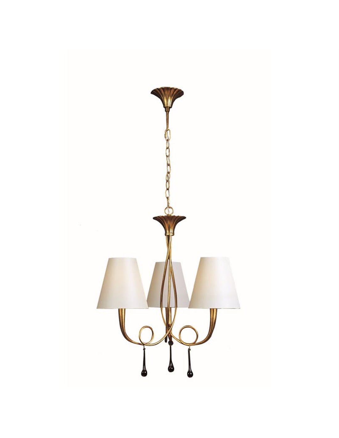 Plafonnier réglable en hauteur de la série Paola dans une finition dorée, il a 3 bras et 3 abat-jour de couleur crème et des larmes de verre noir qui pendent du corps de la lampe. À l'intérieur des 3 abat-jour, il y a 3 bouchons à vis E14 pour installer 3 ampoules LED Candle, nous recommandons qu'elles aient une puissance comprise entre 4 et 7W, une tonalité Warm Light de 3000k.