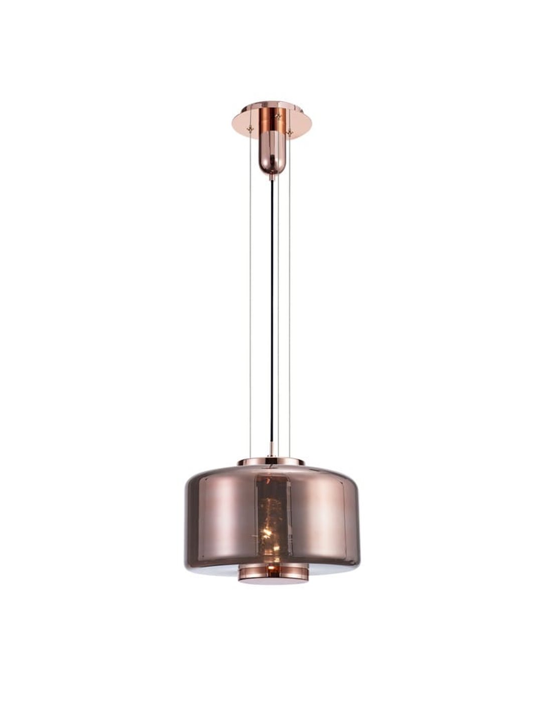 La base du plafond est ronde avec une finition couleur cuivre . L'abat-jour en verre est fixé au câble avec un support supérieur de couleur cuivre. Le verre a un effet réfléchissant ou miroir avec une couleur également Cuivre. Dans la partie inférieure de l'écran se trouve un anneau avec une finition cuivrée.