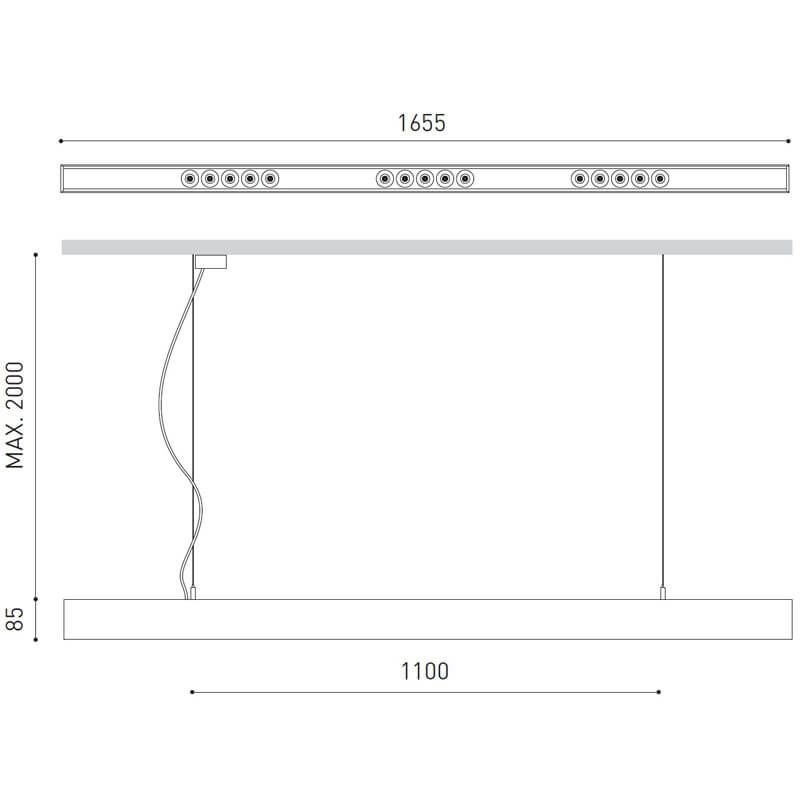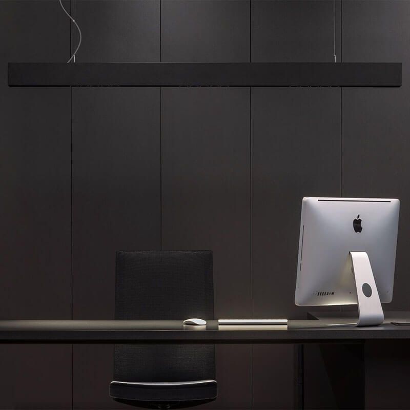 Cette suspension est une application de suspension linéaire dont le design se caractérise par une structure métallique en forme de ligne droite et comprend plusieurs modules circulaires d'où émane la lumière.