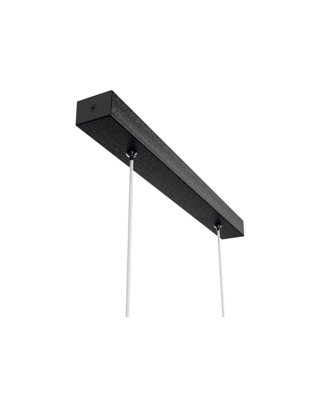 Le plafonnier LED Mantra Black Hanok est composé d'un mini support de plafond rectangulaire noir ainsi que de deux câbles de suspension qui maintiennent l'abat-jour rectangulaire noir avec courbure latérale. L'écran émettra un éclairage avec un faisceau lumineux de 50º.