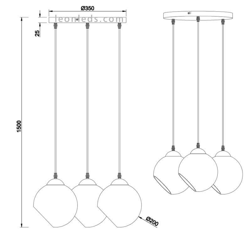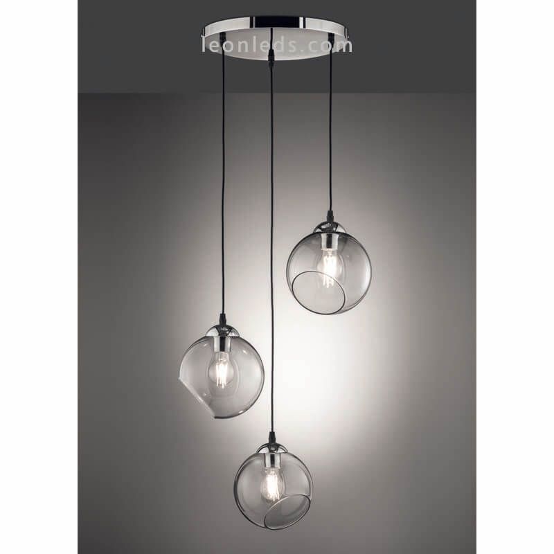 Ce plafonnier en verre appartient à la collection Clooney, il possède trois abat-jour ronds en verre disponibles en 2 finitions, blanc et fumé (gris transparent), le câble est en textile noir et l'abat-jour et le support de plafond sont en métal chromé. La Lampe a une hauteur réglable maximale de 150Cm maximum, un diamètre de 35Cm et un diamètre de chacun des écrans de 20Cm.