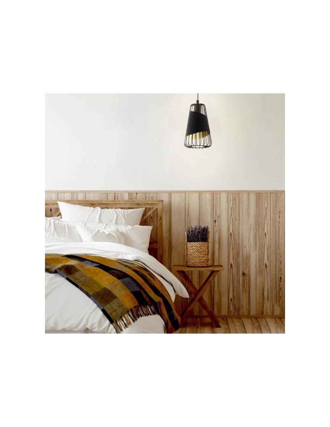 Plafonnier moderne Austell noir avec 1 abat-jour en bandes d'acier noires de la collection Austell par Eglo Iluminación. C'est une lampe élégante et moderne parfaite pour toutes les pièces qui nécessitent à la fois un éclairage et une décoration avec des touches de noir et d'or. Son écran est dominé par de l'acier noir en forme de lamelles, et un surécran noir à l'extérieur et doré à l'intérieur. Vous avez besoin d'une ampoule avec douille E27 (non incluse). Nous conseillons l'utilisation d'ampoules LED à filament de type globe pour renforcer son style rétro, puisqu'elles seront légèrement visibles derrière leur écran semi-transparent. Choisissez de préférence un ton chaud comme 3 000k qui rehaussera cet effet vintage ou rétro recherché lorsqu'il sera reflété dans la partie intérieure de l'écran doré. La puissance recommandée est de 10 à 17W selon les dimensions de la pièce que nous devons éclairer. Son écran mesure 16,5 cm de diamètre.
