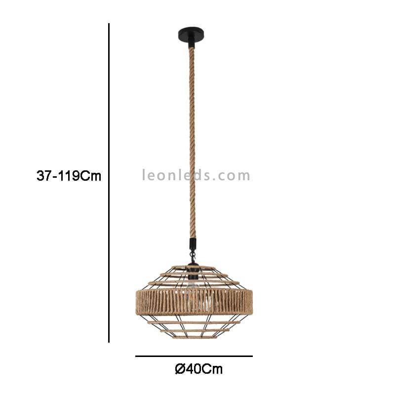 Plafonnier en corde et métal Rustica , le câble textile et le support de plafond sont noirs, la hauteur est réglable de 37Cm à 119Cm et l'écran a un diamètre de 40Cm, il vous faut 1 ampoule LED avec filetage E27, (Non inclus).