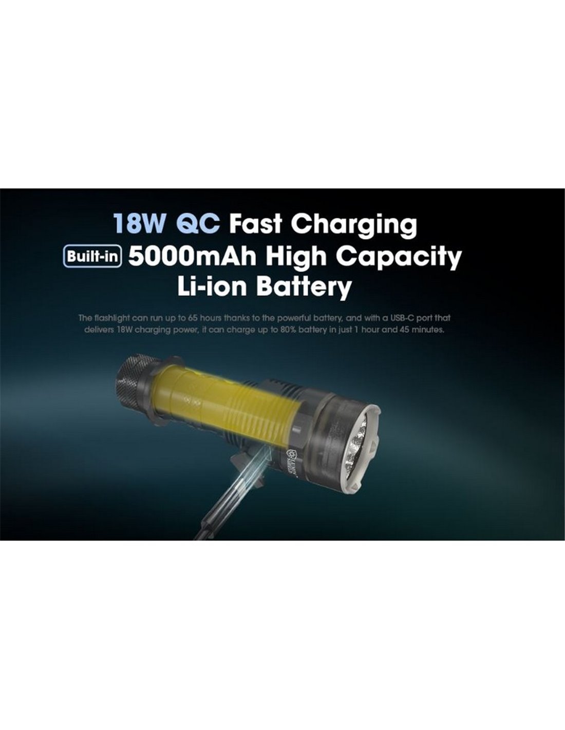 La lampe de poche LED TM9K PRO offre une puissance impressionnante de 9 900 lumens avec une portée allant jusqu'à 510 mètres . Conçu pour des utilisations tactiques, militaires et de recherche et sauvetage, il comprend une batterie lithium-ion rechargeable de 5 000 mAh , une certification IP68 et plusieurs niveaux de luminosité, le tout dans un design compact de 133 mm de long.