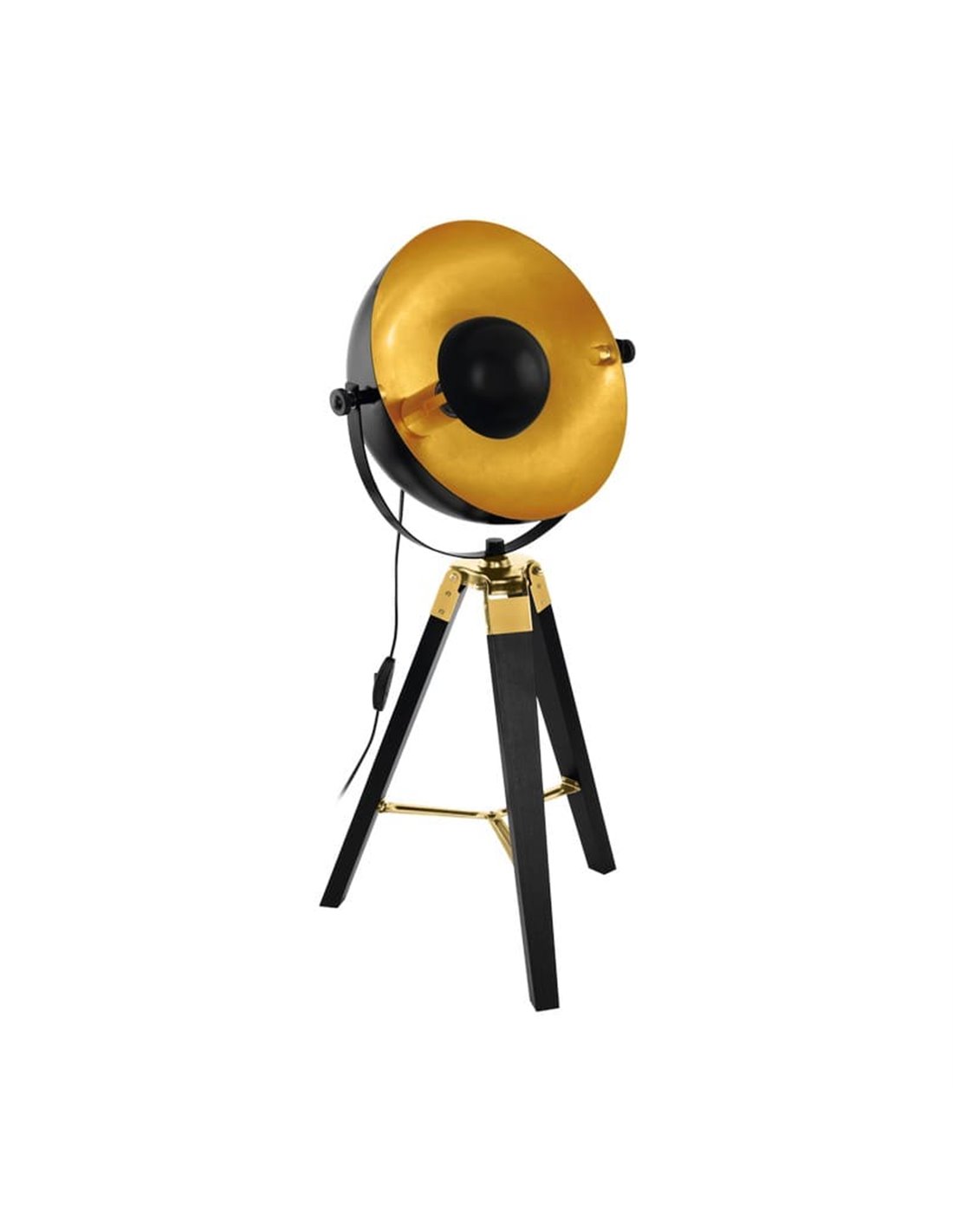 Lampe de table COVALEDA de EGLO avec pied en bois noir et abat-jour en métal doré. Idéal pour les styles industriels. Convient aux ampoules E27 (non incluses).