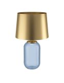 Cette lampe de table est originale et s'intègre dans n'importe quel espace grâce à son verre bleu transparent. De plus, son abat-jour conique en laiton brossé, qui imite la couleur de l'or, vous ravira par sa polyvalence et sa subtilité.