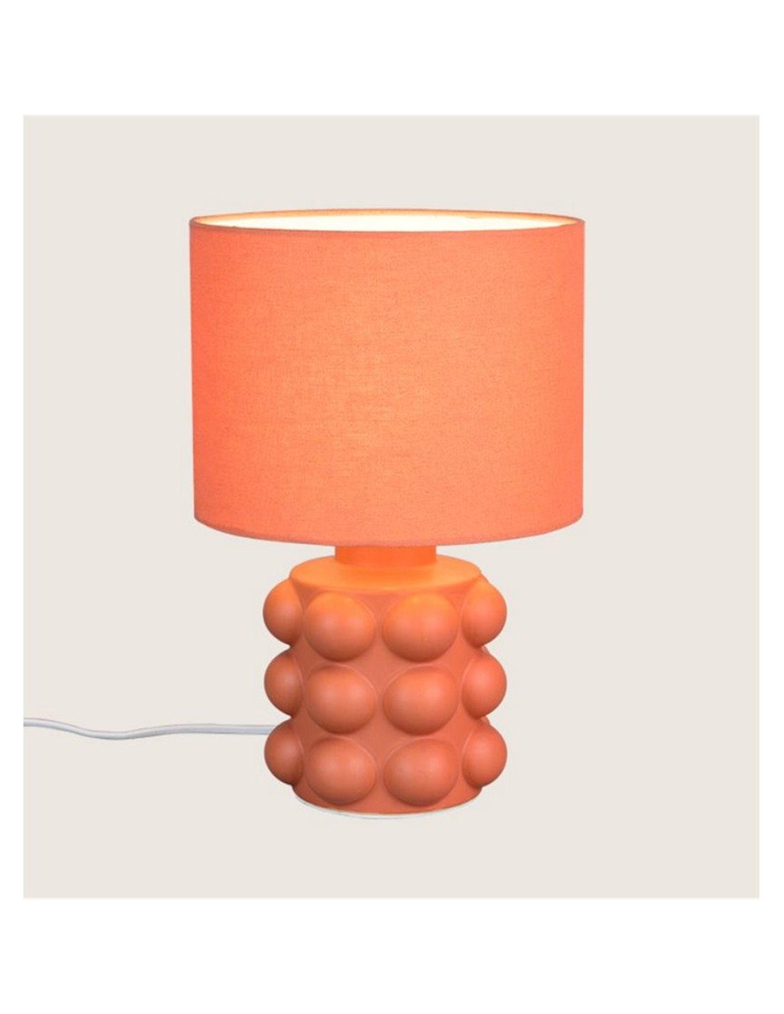 La lampe de table KATE , finition orange abricot , allie design et chaleur pour une pièce décorative d'inspiration moderne. Son pied en céramique émaillée à la texture géométrique est complété par un abat-jour cylindrique en tissu blanc qui diffuse une lumière agréable et diffuse, idéale pour créer des ambiances relaxantes et chaleureuses.