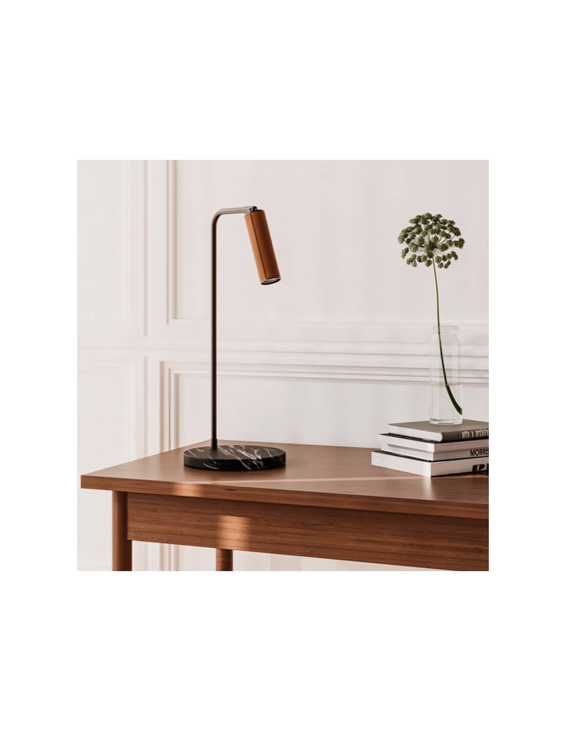 Faites l'expérience de la sophistication avec la lampe de table LED TURA d'Aromas del Campo . Fusionnant le métal, le cuir et le marbre en noir mat ou marron, cette lampe est un joyau moderne. Avec une puce LED dimmable de 5 W, un variateur à câble et une classe énergétique A++, il offre un éclairage élégant et efficace pour votre espace.