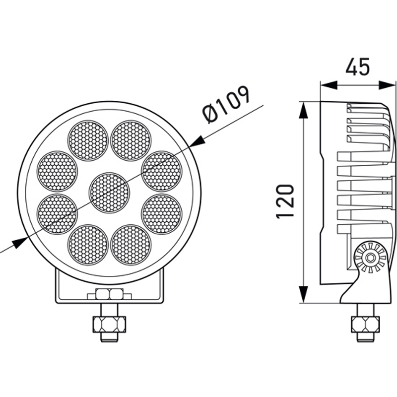 Phare de travail LED rond de la marque Hella TR3000 d'une puissance de 31W, d'une intensité lumineuse de 3000Lm et d'un degré de protection contre l'eau et la poussière de IP67 et IP69K, il dispose d'un total de 9 LED et d'une tonalité lumineuse de 5700K. Il comprend 0,8 m de câble et peut être installé en 12V et 24V.