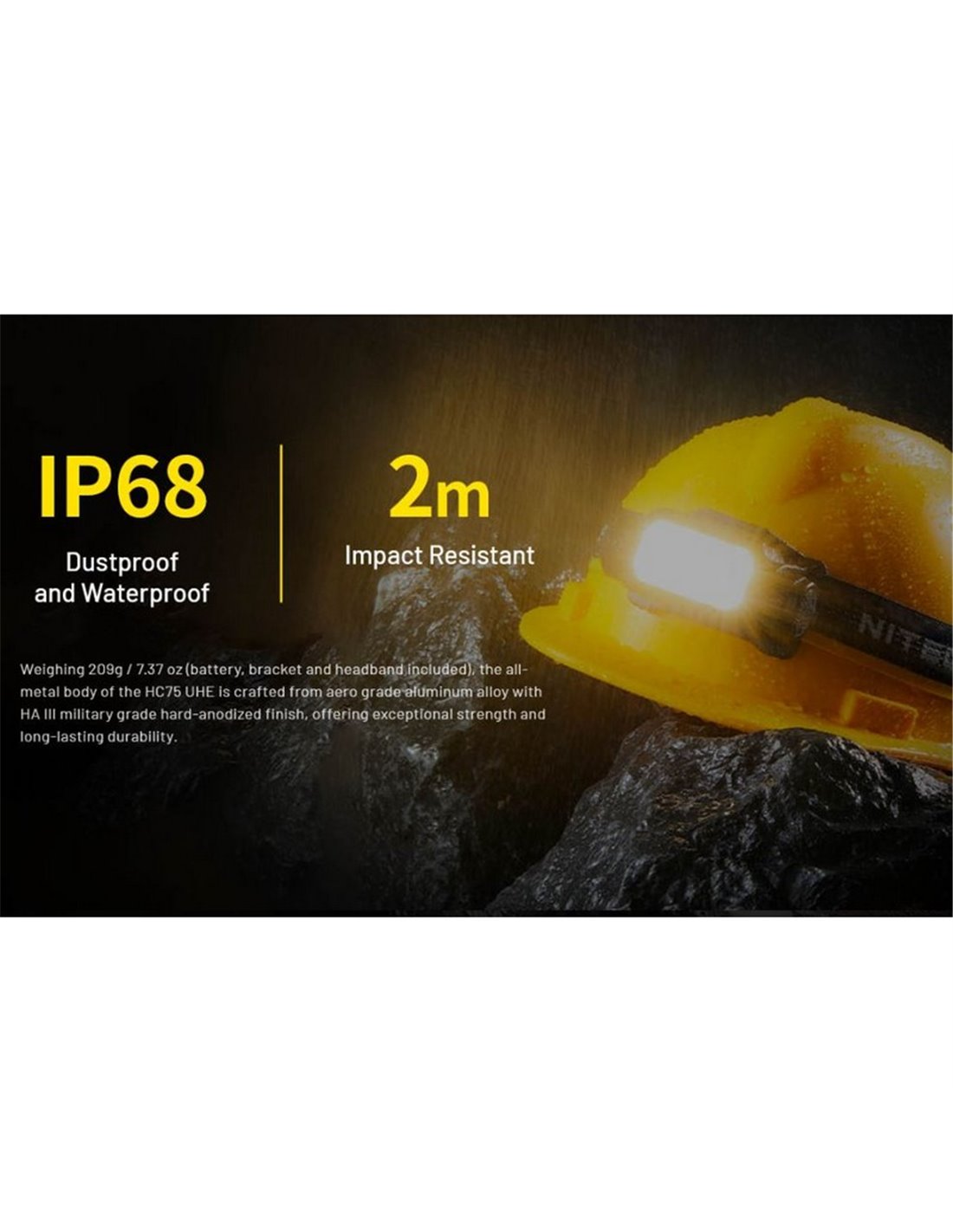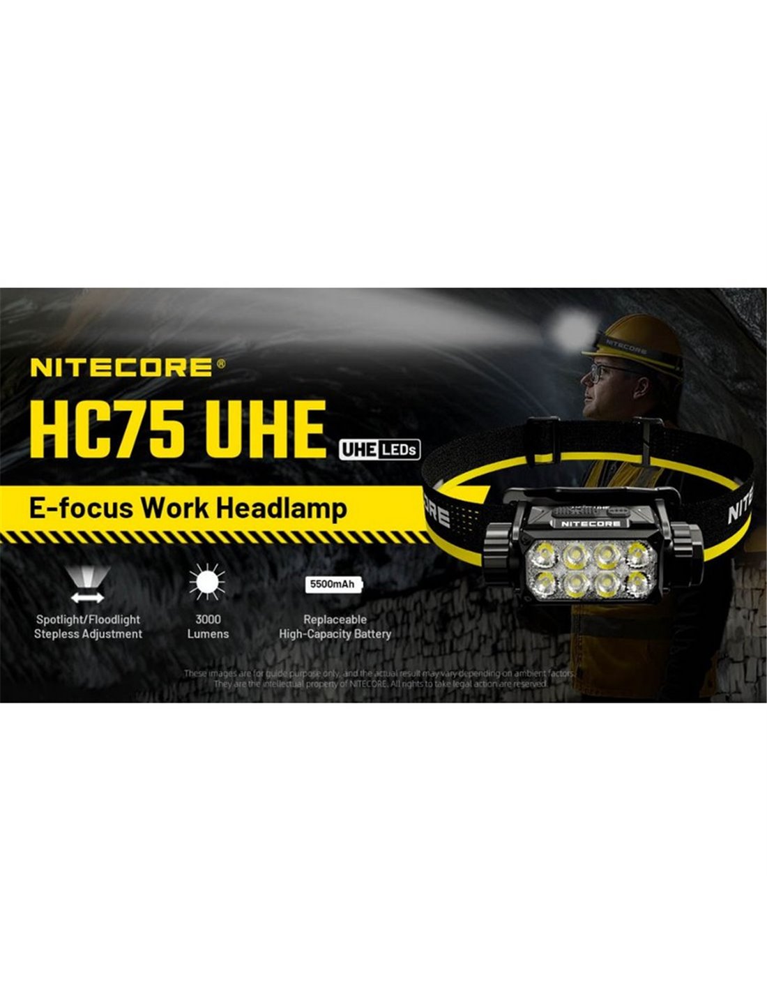 Lampe frontale Nitecore HC75 UHE d'une puissance maximale de 3 000 lumens et d'une portée allant jusqu'à 192 mètres . Équipée d' une batterie rechargeable de 5 500 mAh via USB-C , d'une mise au point électronique pour le réglage entre lumière diffuse et spot, de modes lumière blanche et rouge , et d'une protection IP68 . Idéale pour les travaux exigeants et les activités de plein air.