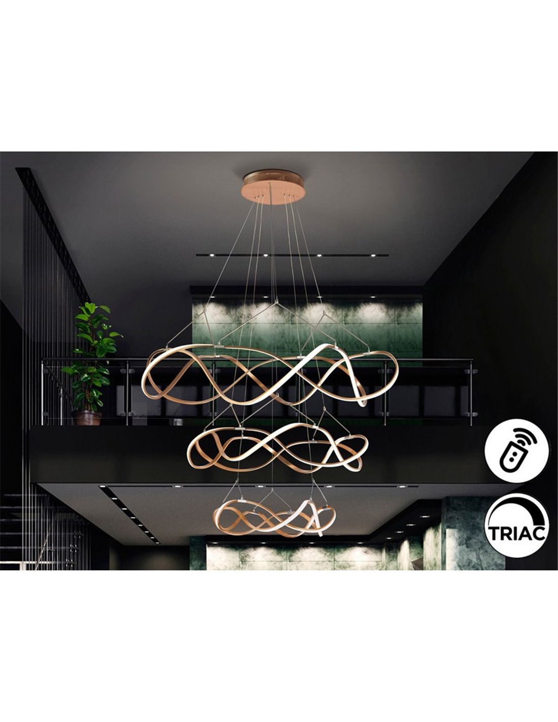 La suspension MOLLY à trois anneaux se distingue par son design sculptural et son allure décorative, idéale pour les grands salons, les salles à manger modernes et les espaces où l'éclairage est primordial. Sa structure en aluminium brossé or rose , associée à des détails chromés, offre une finition élégante et raffinée qui s'intègre parfaitement aux projets d'aménagement intérieur contemporains.