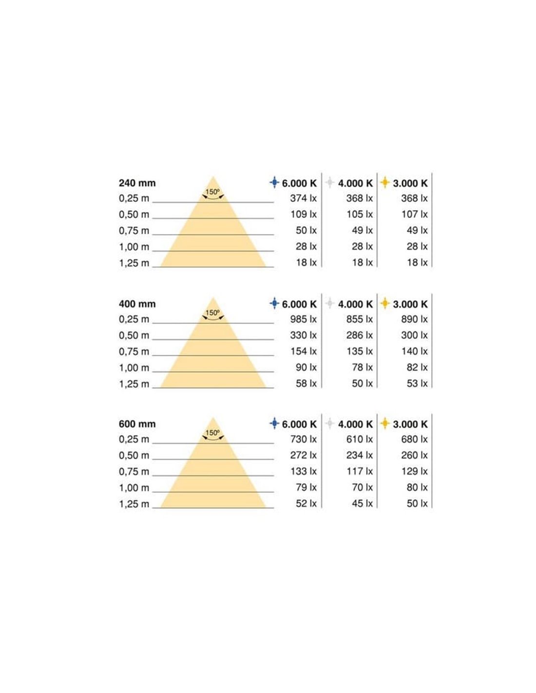 - Température de couleur réglable : Permet de sélectionner entre 3000K (blanc chaud), 4000K (blanc neutre) et 6000K (blanc froid) , s'adaptant aux besoins spécifiques de chaque environnement.