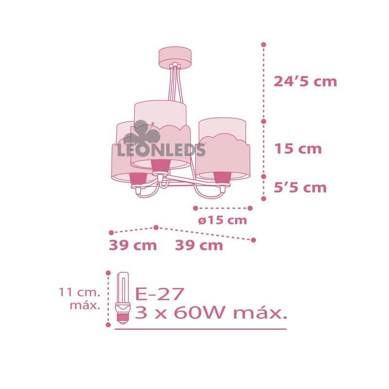 Cette suspension bébé rose 3 lumières offre une hauteur de 45cm, une largeur de 39cm et une longueur de 39cm et les trois abat-jour ont un diamètre de 15cm, vous pouvez voir toutes ces dimensions sur une des photos.
