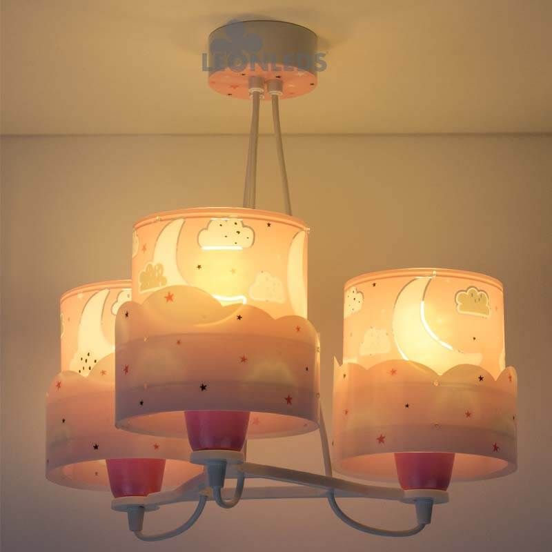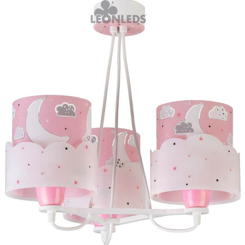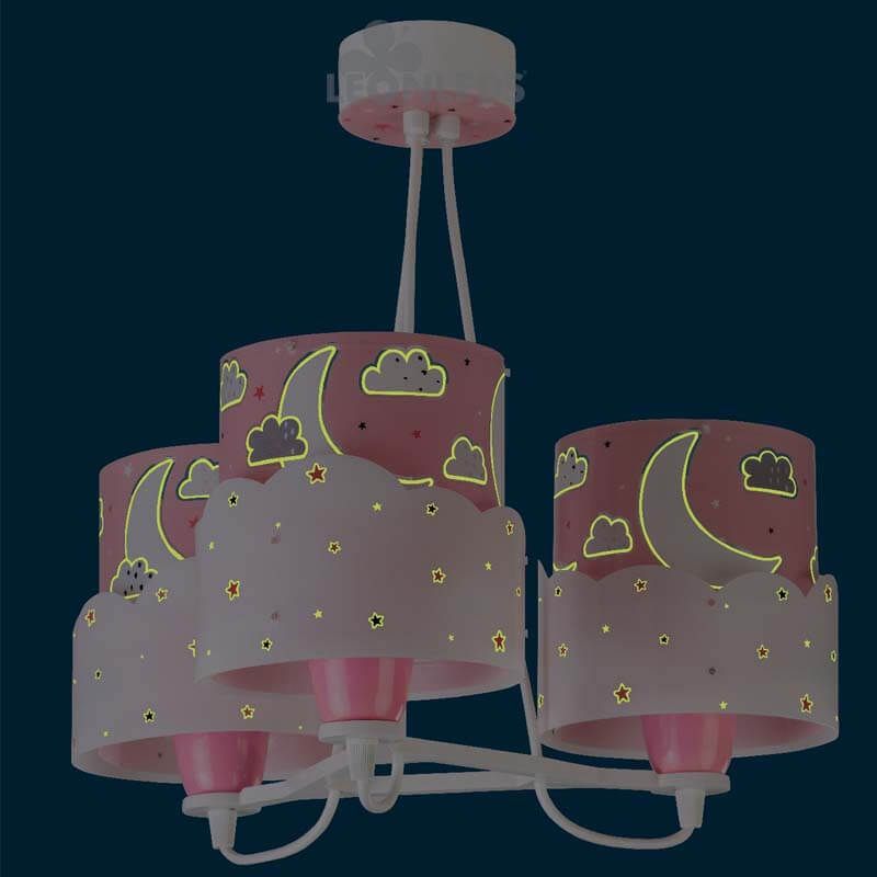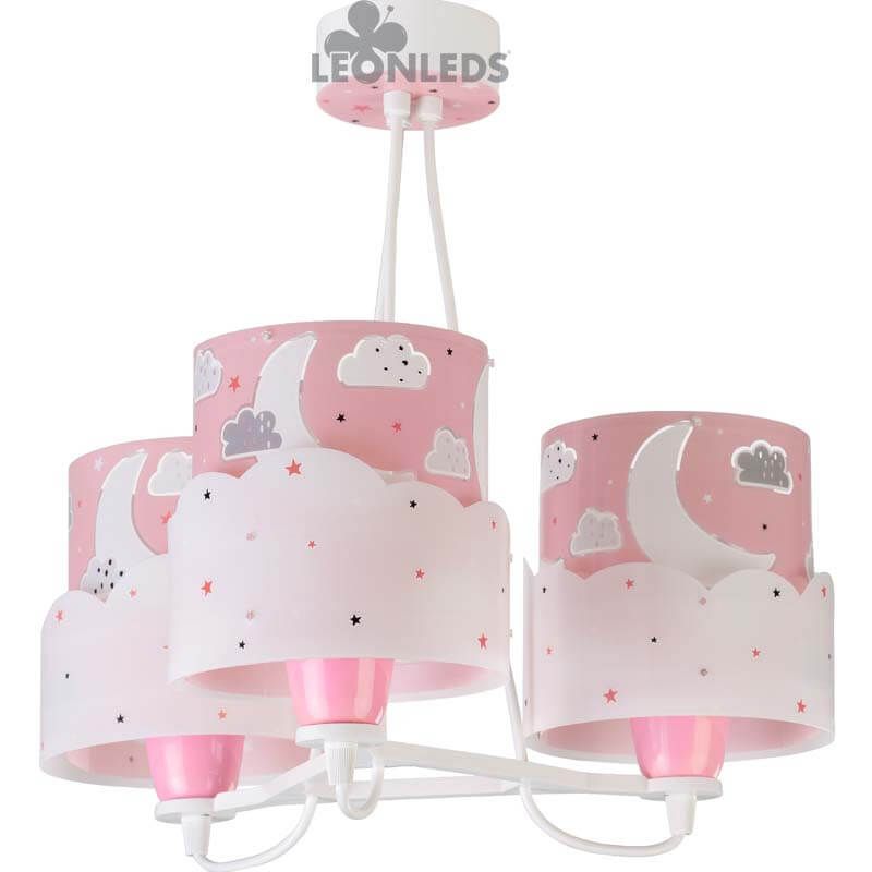 Suspension 3 lumières pour bébé en rose de la nouvelle collection Moon , les 3 abat-jours sont roses et blancs avec un décor d'étoiles, de lunes et de nuages qui brillent dans le noir, la structure est blanche et rose et permet d'installer 3 ampoules LED avec filetage E27 d'une longueur maximale de 11 cm.