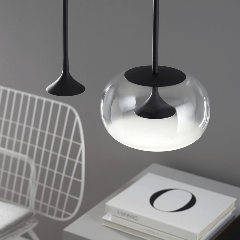Cette suspension Alive noire est dotée d'une structure en forme de trompette en acier avec une finition sombre, qui sert de support à l'abat-jour en PMMA.