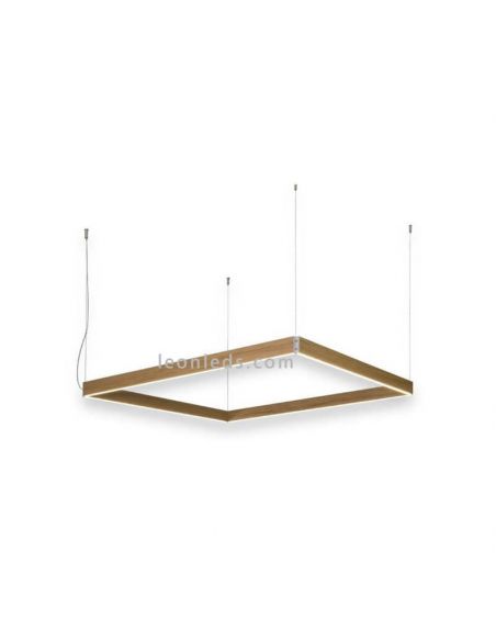 Son écran large et carré est composé d'aluminium, de bois et d'acrylique , ce qui le rend facile à nettoyer et à entretenir. Sa conception utilisant des câbles en acier permet à la lampe de s'accrocher sur ses quatre côtés, lui donnant une polyvalence, générant un effet flottant. C'est un plafonnier suspendu très polyvalent qui s'intègre facilement dans l'espace avec son esthétique originale et suggestive.