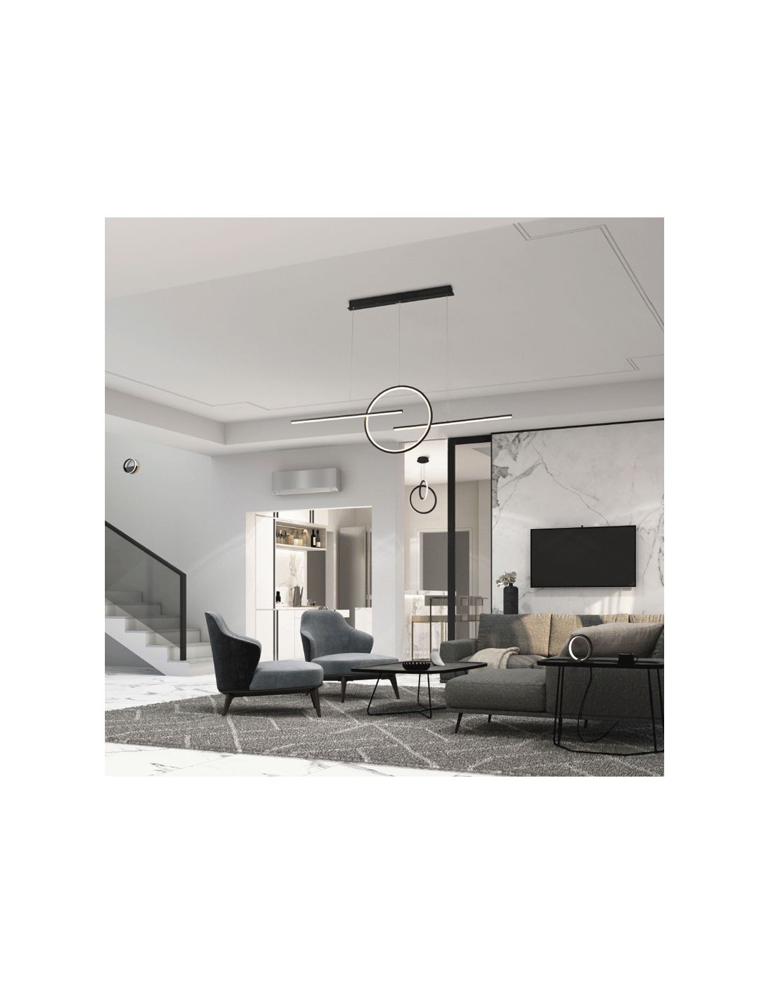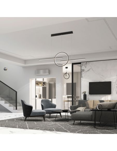 Suspension LED linéaire, disponible en blanc et noir, elle intègre la technologie LED avec une puissance de 50W, une tonalité lumineuse chaude de 3000K et une intensité lumineuse de 4000LM, équivalent à plus de 270W d'une ampoule ancienne. Cette suspension LED linéaire a une hauteur réglable jusqu'à 150cm, une largeur de 10cm et une longueur de 124cm, la lumière est émise de l'intérieur de l'anneau et de la partie inférieure des deux qui composent cette lampe, le visuel effet que Ce que cette lampe offre, c'est que l'anneau et les 2 barres lévitent, créant une lampe unique sur le marché.