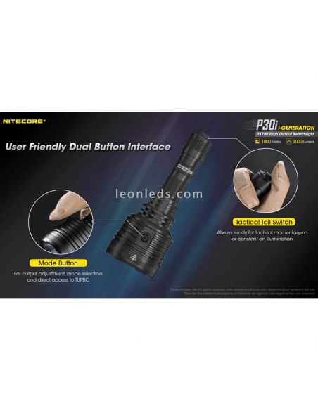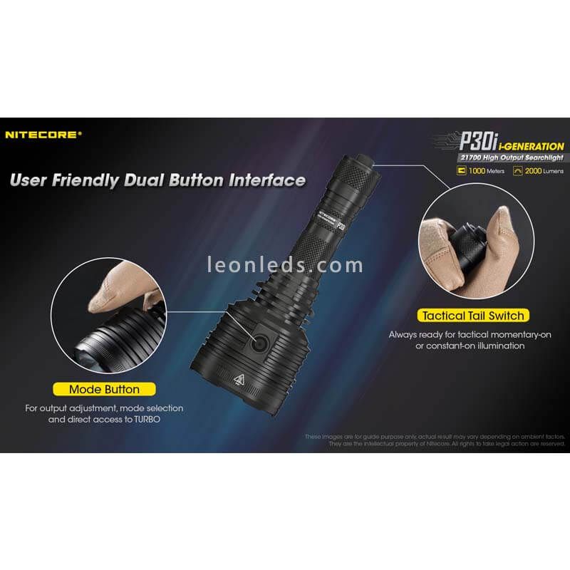 Le fonctionnement de la lampe de poche Nitecore P30i est totalement polyvalent, grâce à un interrupteur sur la queue qui vous permet de l'allumer et d'atteindre 2 000 lumens dans son mode de puissance maximale , et un interrupteur latéral qui vous permet de changer les 7 modes d'éclairage de cette longue Lampe de poche à portée allant de 2 000 lumens à 6 lumens dans son mode de puissance minimale.