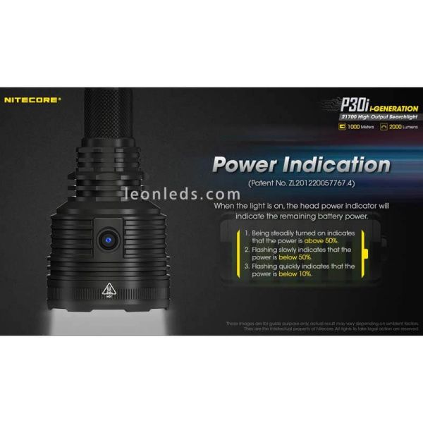 La lampe de poche LED P30i 2000 lumens est facile à utiliser grâce à l' indicateur LED sur sa tête avant qui indiquera en bleu et de manière fixe que nous avons plus de 50% de la batterie, avec un léger clignotement il indiquera que nous avons moins de 50% et avec un clignotement rapide, cela indiquera que nous avons moins de 10% de la batterie.