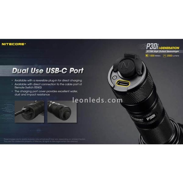 Grâce à sa batterie lithium rechargeable 21700 intégrée à la télécommande de la lampe torche P30i vous obtiendrez une performance très puissante. De plus, la recharge se fait via un port USB Type-C sur le capot arrière, qui à son tour permet l'incorporation d'un bouton de commutation à distance inclus dans l'emballage (câble).