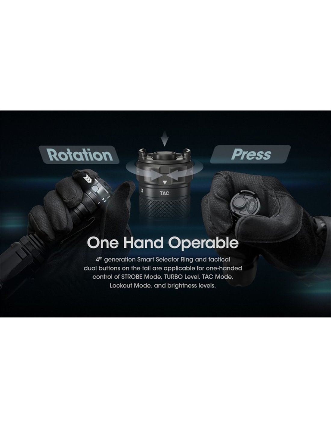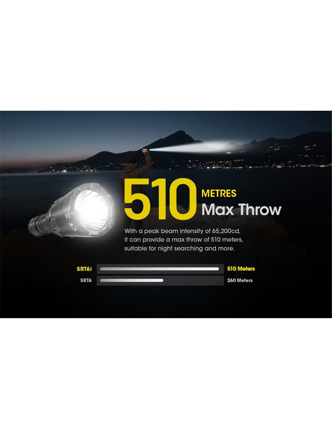 La lampe de poche NITECORE SRT6i délivre jusqu'à 2100 lumens de puissance avec une portée de 510 mètres . Intègre la technologie Smart Selector Ring pour une sélection rapide