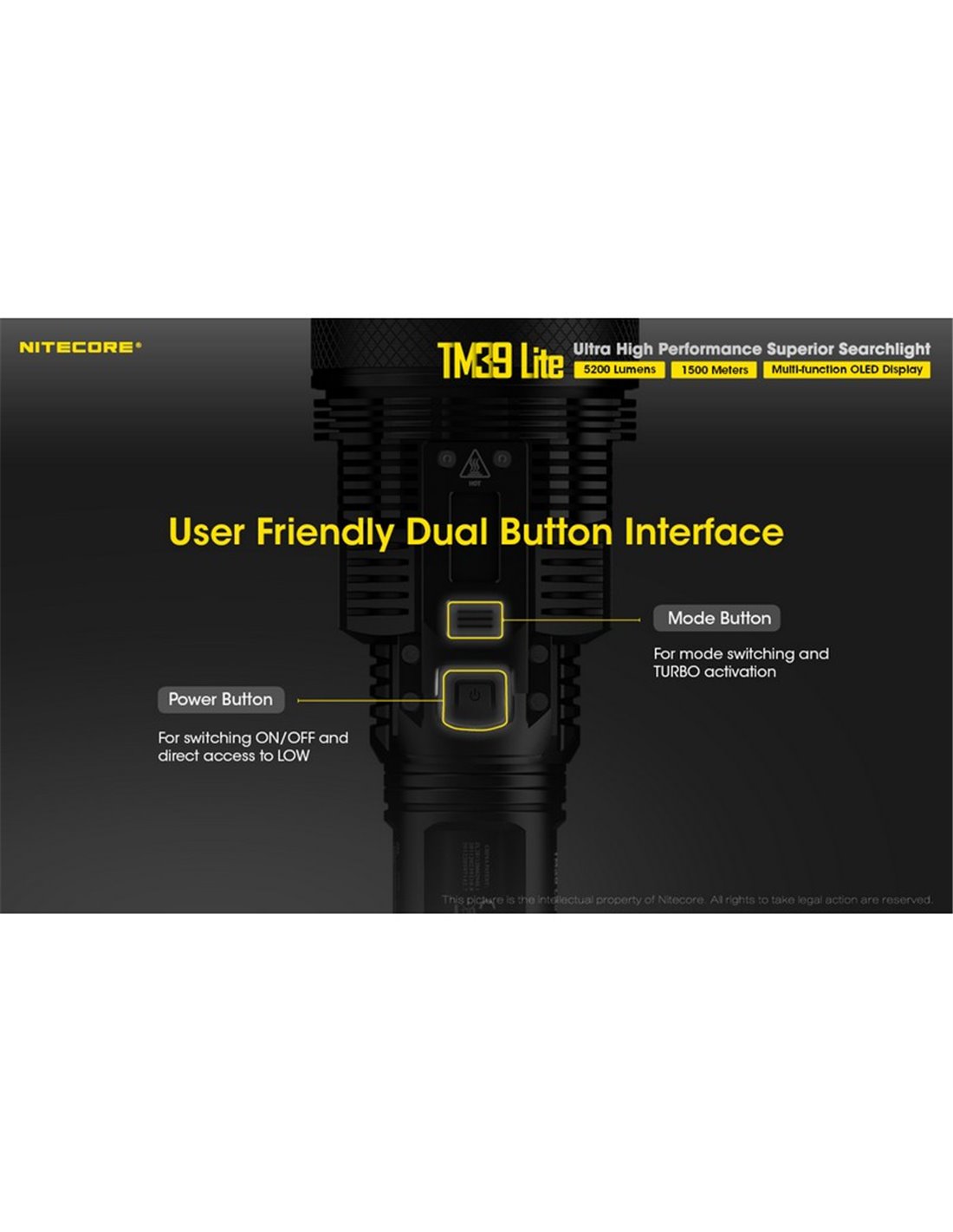 La lampe de poche portable NITECORE TM39 Lite est le choix idéal pour ceux qui ont besoin d'un éclairage puissant et longue portée . Avec une puissance de 5200 lumens et une portée allant jusqu'à 1500 mètres , cette lampe de poche est parfaite pour les tâches de recherche et de sauvetage . Son écran OLED multifonctionnel affiche des données en temps réel telles que la luminosité, la tension et la durée de vie de la batterie. De plus, il est construit en alliage d'aluminium de qualité aérospatiale , avec une finition anodisée HA III de qualité militaire, garantissant une résistance et une durabilité élevées. Certifié IP68 , il est totalement étanche à l'eau et à la poussière.