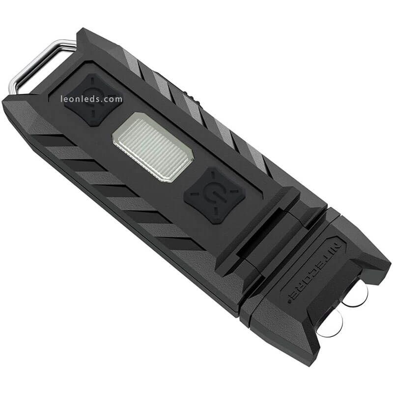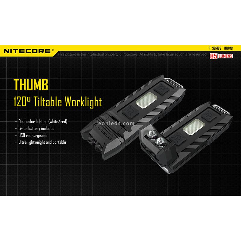 Lampe de poche porte-clés Nitecore 85 lumens rechargeable Thumb LED avec lumière réglable à 120º. Cette lampe de poche est en polycarbonate, a une puissance de 85 lumens et une portée de 26 mètres. Comprend 2 LED avant avec 3 niveaux de puissance et 3 LED latérales rouges et bleues.