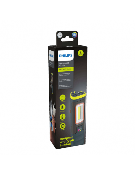La lampe Philips Xperion 6000 UV Pillar de haute qualité est une lampe de travail polyvalente avec plusieurs sources lumineuses puissantes et des fonctionnalités de pointe. Les mensurations sont très remarquables : une hauteur de 23 cm, une longueur de 5,2 cm avec un poids avec piles de 432 g.