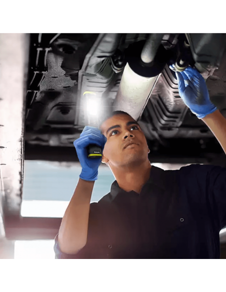 La poignée ergonomique avec revêtement antidérapant vous permettra de tenir cette lampe de travail en toute sécurité. De plus, c'est un instrument qui a été conçu pour être utilisé dans des environnements de travail exigeants, grâce à sa résistance aux chocs IK07, à son étanchéité IP65 et à sa surface résistante aux substances chimiques et aux solvants utilisés dans les ateliers.