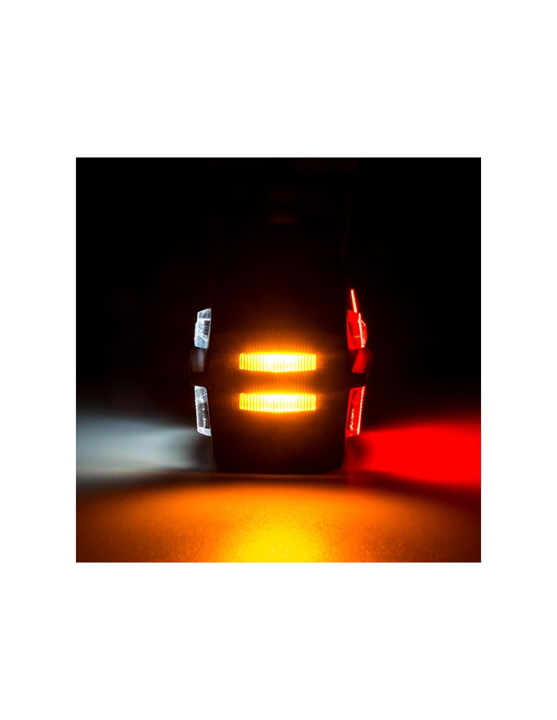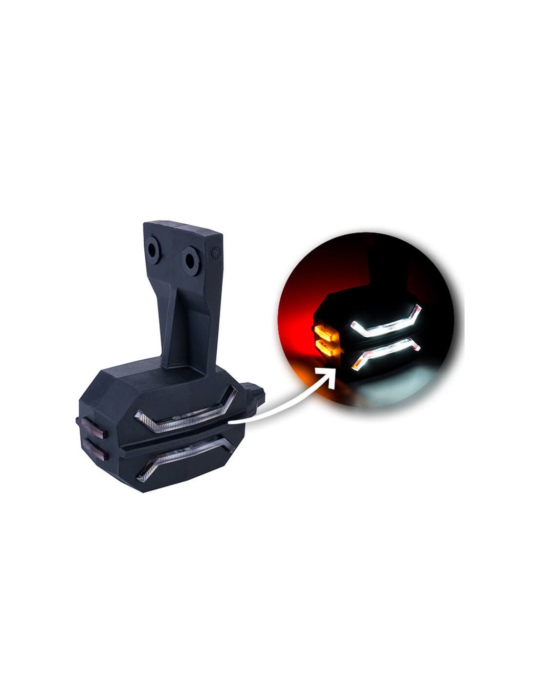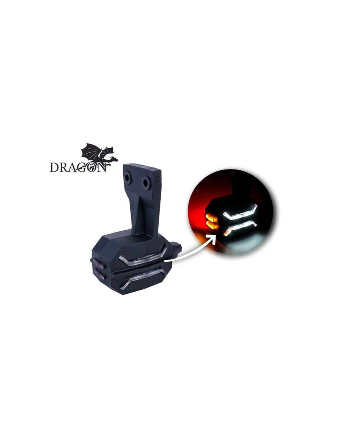 LED Galibo avec support de remorque flexible 3 fonctions Dragon avec feu de position avant blanc, feu arrière rouge et feu latéral ambre, à l'avant et à l'arrière l'hologramme de la marque Horpol illumine, comprend un demi-mètre de câble pour son installation. Codes d'homologation gravés SM1, AM et RM1 et R10. Protège-main, sélectionnez le bon côté. Le support permet d'installer ce Galibo suspendu.