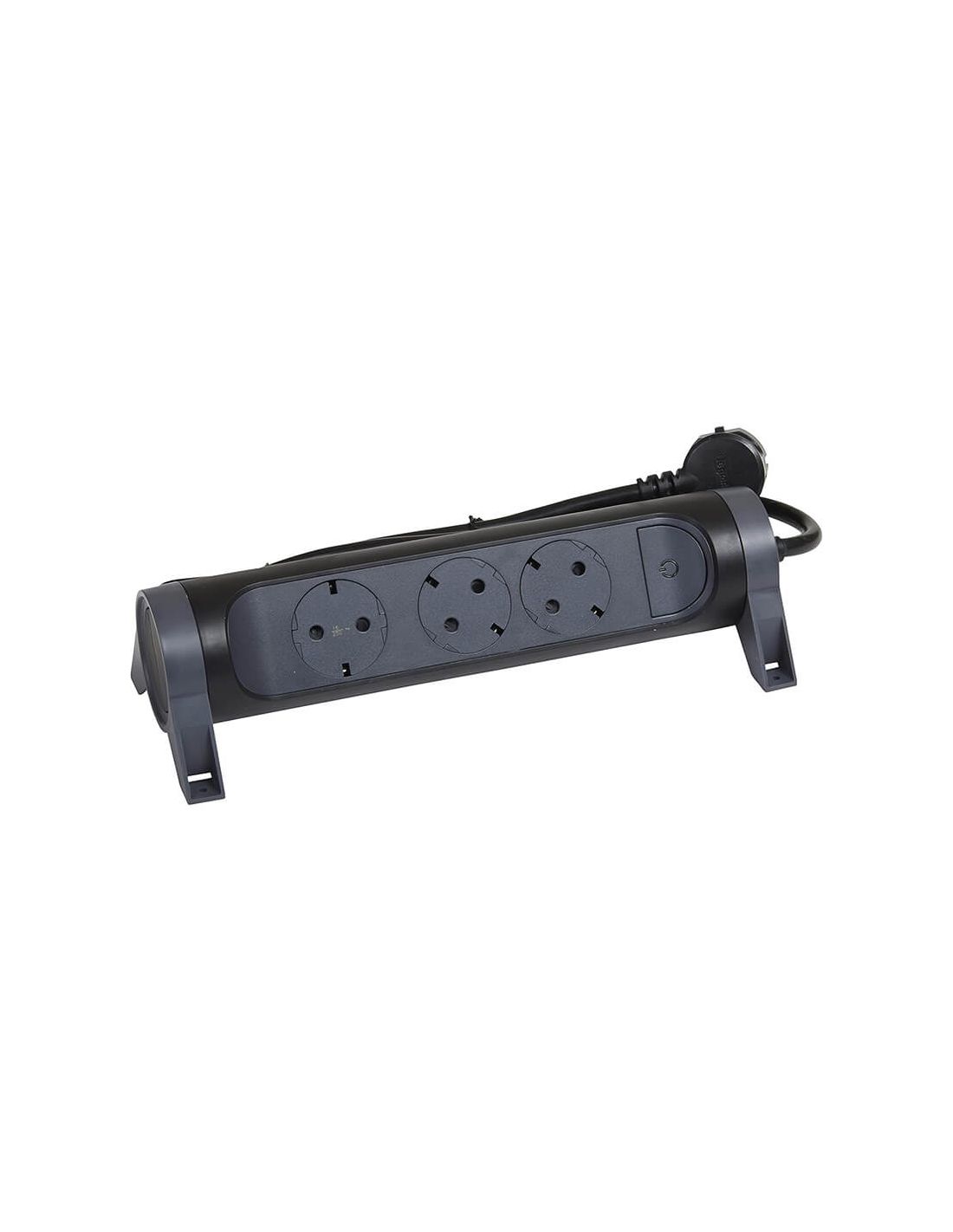 Bloc multiprise Legrand avec trois prises Schuko 2P+T frontales, câble de 1,5 m, section 1,5 mm². Prise 90°, interrupteur marche/arrêt lumineux bleu et fixation murale. Design compact et sécurisé pour la maison ou le bureau.