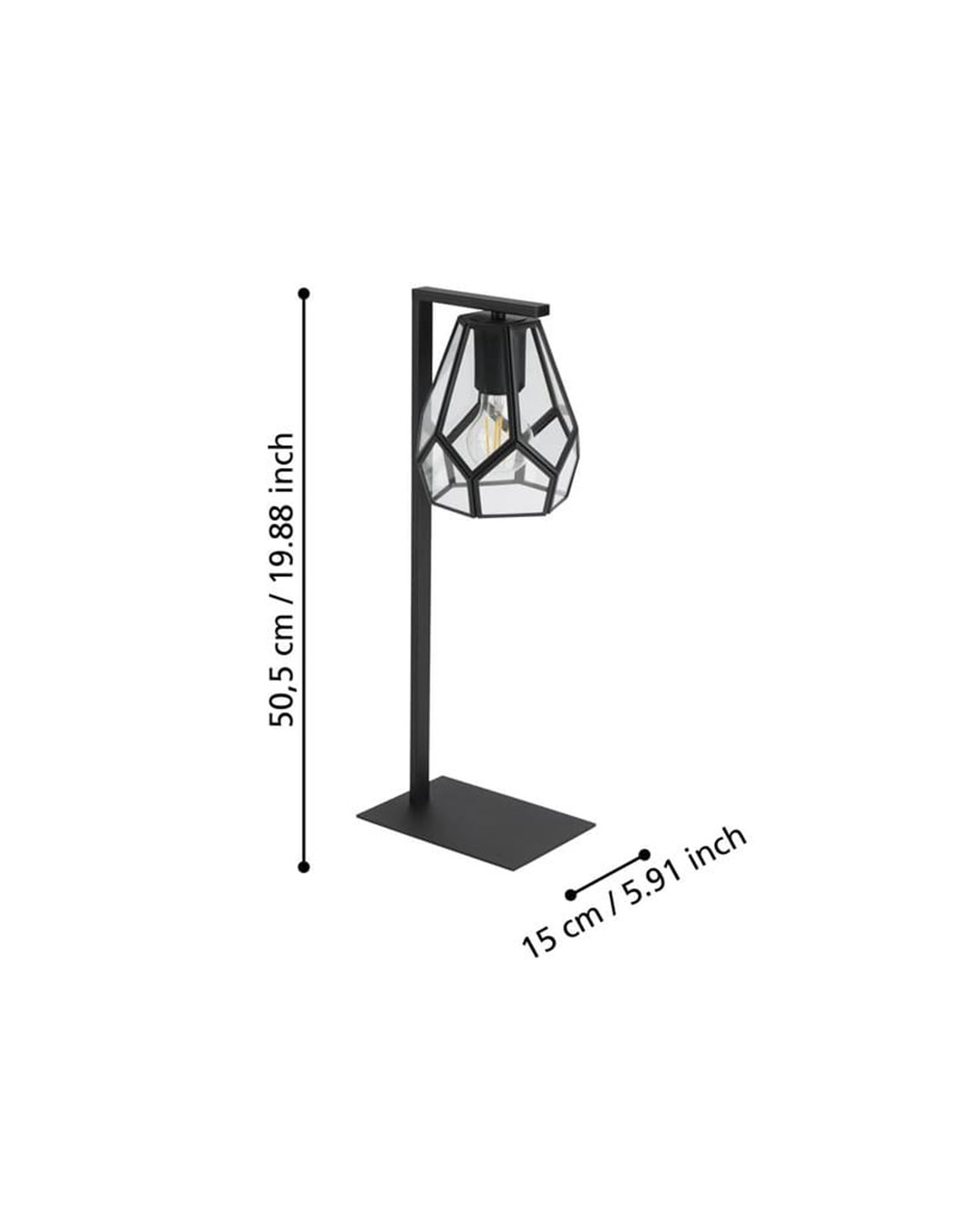 La lampe de table MARDYKE d'EGLO allie design et fonctionnalité dans une pièce unique. Sa structure en métal noir avec un abat-jour en verre en forme de losange crée un jeu de lumière qui apporte chaleur et style à n'importe quel espace.