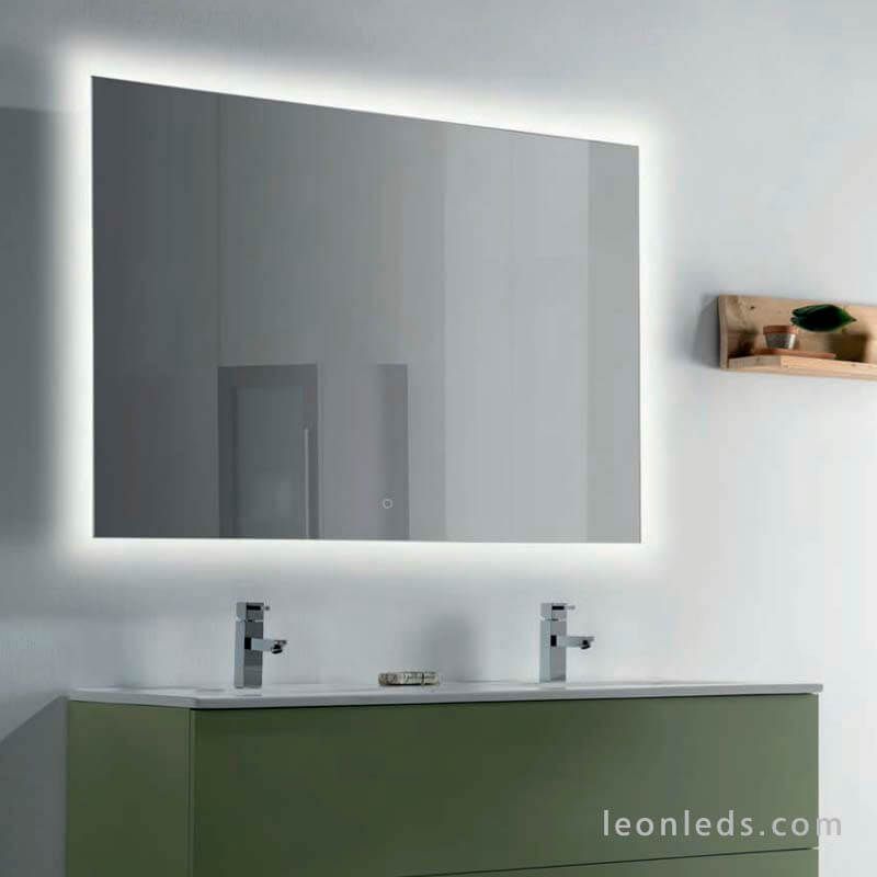 Miroir de salle de bain LED Estela , disponible en deux versions : 48 W (4 129 lumens, dimensions : 70 cm x 80 cm x 3 cm) et 58 W (4 994 lumens , dimensions : 70 cm x 110 cm x 3 cm). Proposé en deux températures de couleur : chaude (3 000 K) ou naturelle (4 000 K). L’éclairage s’active par un bouton tactile situé en bas au centre du miroir.