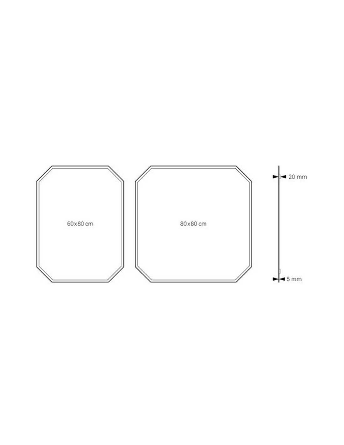 Le miroir non éclairé SUKUR est une élégante option de forme polygonale, disponible en deux tailles : 60 x 80 cm et 80 x 80 cm . Doté d'un verre de 5 mm d'épaisseur et d'un bord biseauté de 5 mm , il offre robustesse et finition professionnelle. La distance au mur est de 20 mm et son système d'ancrage à nivellement assure une installation facile et précise.