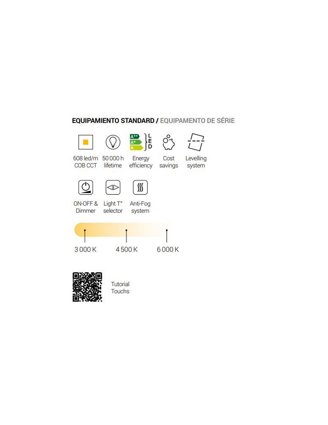 Le premier bouton tactile permet d'allumer et d'éteindre le miroir, et le Dimmer nous offre la possibilité de sélectionner l'intensité de la lumière ; cette option reste également mémorisée lors de la prochaine allumage ;
