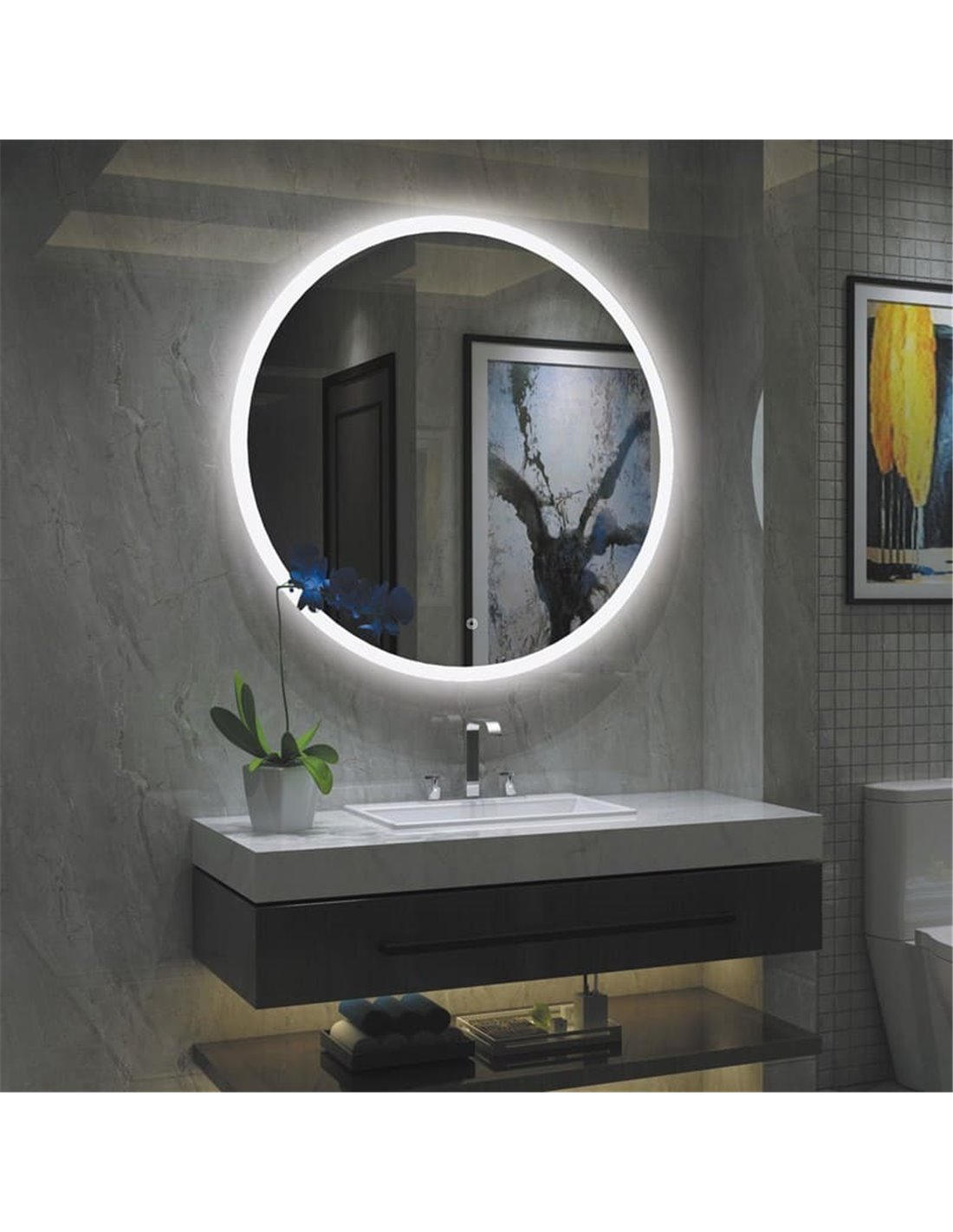 Le miroir rond éclairé par LED PETRA est une solution d'éclairage élégante et fonctionnelle, idéale pour toute salle de bain moderne. Avec un design rond et un bouton tactile, ce miroir offre commodité et style. L'éclairage LED intégré de 58 W offre une température de couleur chaude de 3 000 K et un flux lumineux de 3 927 lumens , garantissant un éclairage uniforme et agréable.
